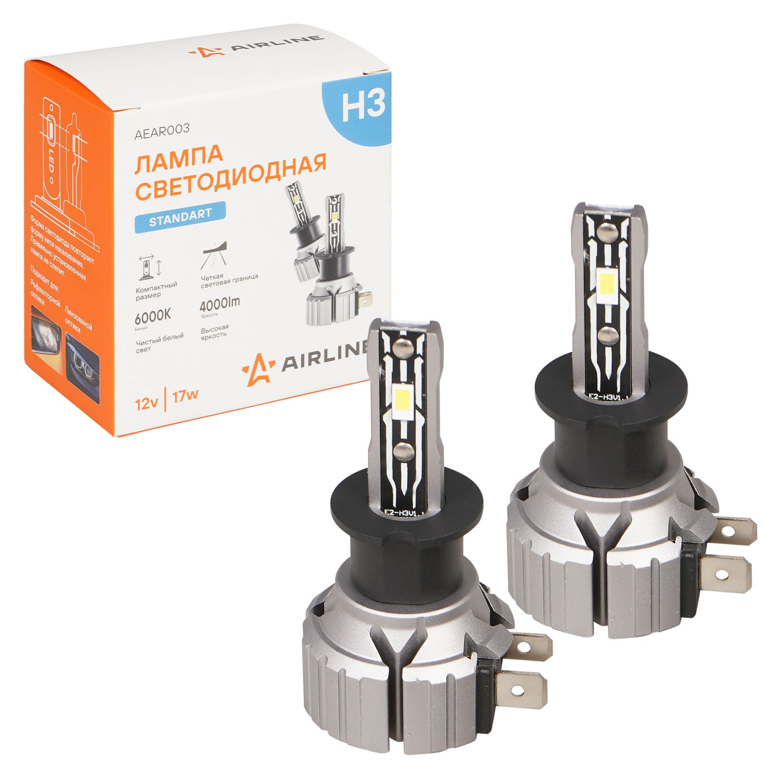 Лампа светодиод. H3 STANDARD, 17Вт, 4000Лм (2000Лм x 2), 6000К, 12В, кмпл. 2 шт. (AEAR003)