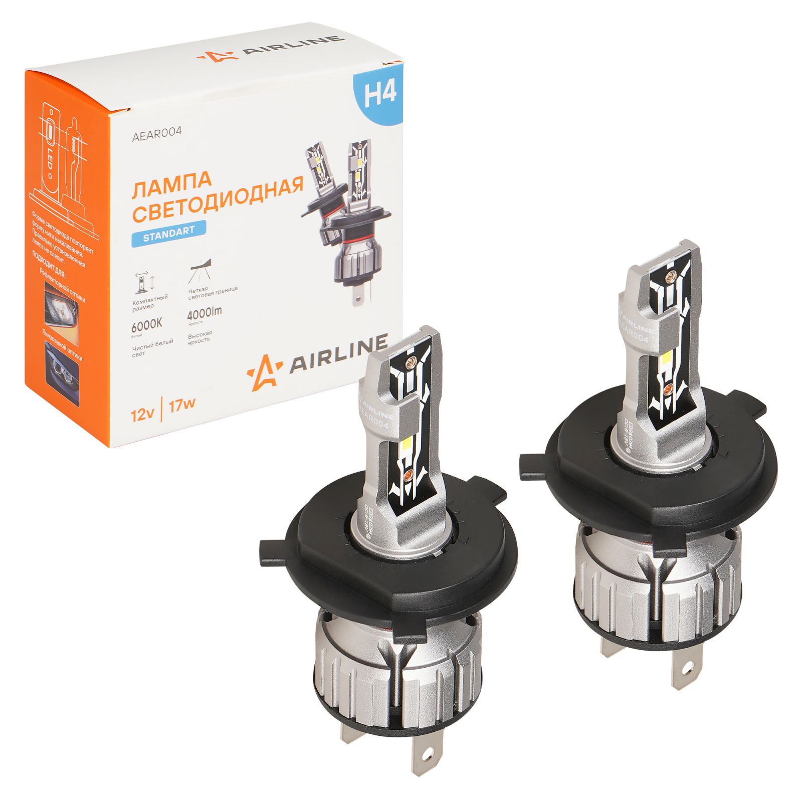 Лампа светодиод. H4 STANDARD, 17Вт, 4000Лм (2000Лм x 2), 6000К, 12В, кмпл. 2 шт., (AEAR004)