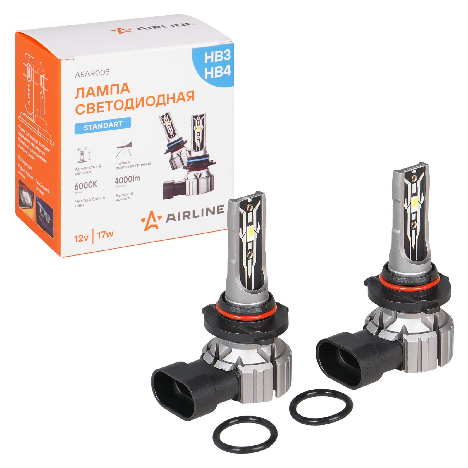 Лампа светодиод. HB3/HB4 STANDARD, 17Вт, 4000Лм (2000Лм x 2), 6000К, 12В, кмпл. 2 шт. (AEAR005)