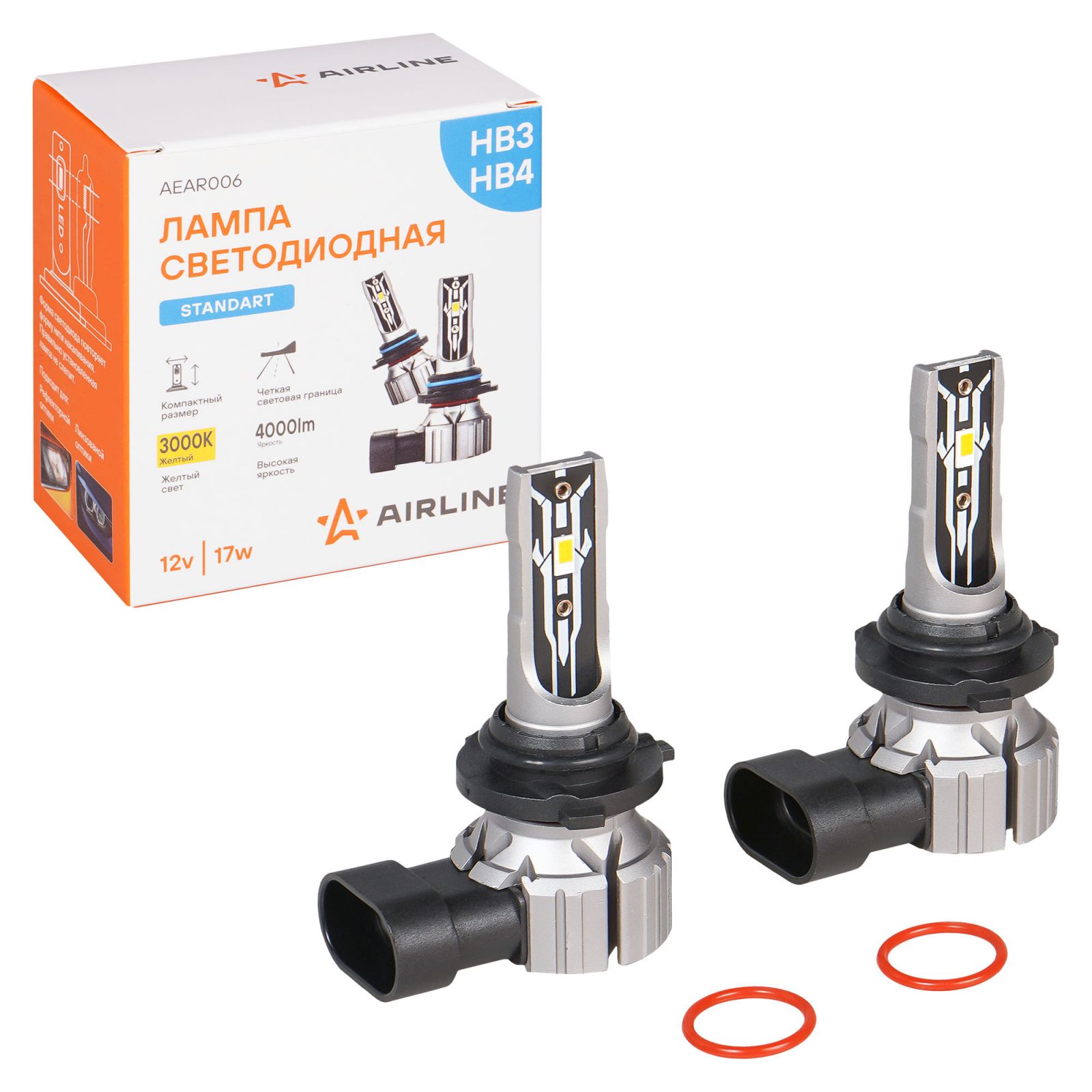 Лампа светодиод. HB3/HB4 STANDARD, 17Вт, 4000Лм (2000Лм x 2), 3000К, 12В, кмпл. 2 шт. (AEAR006)