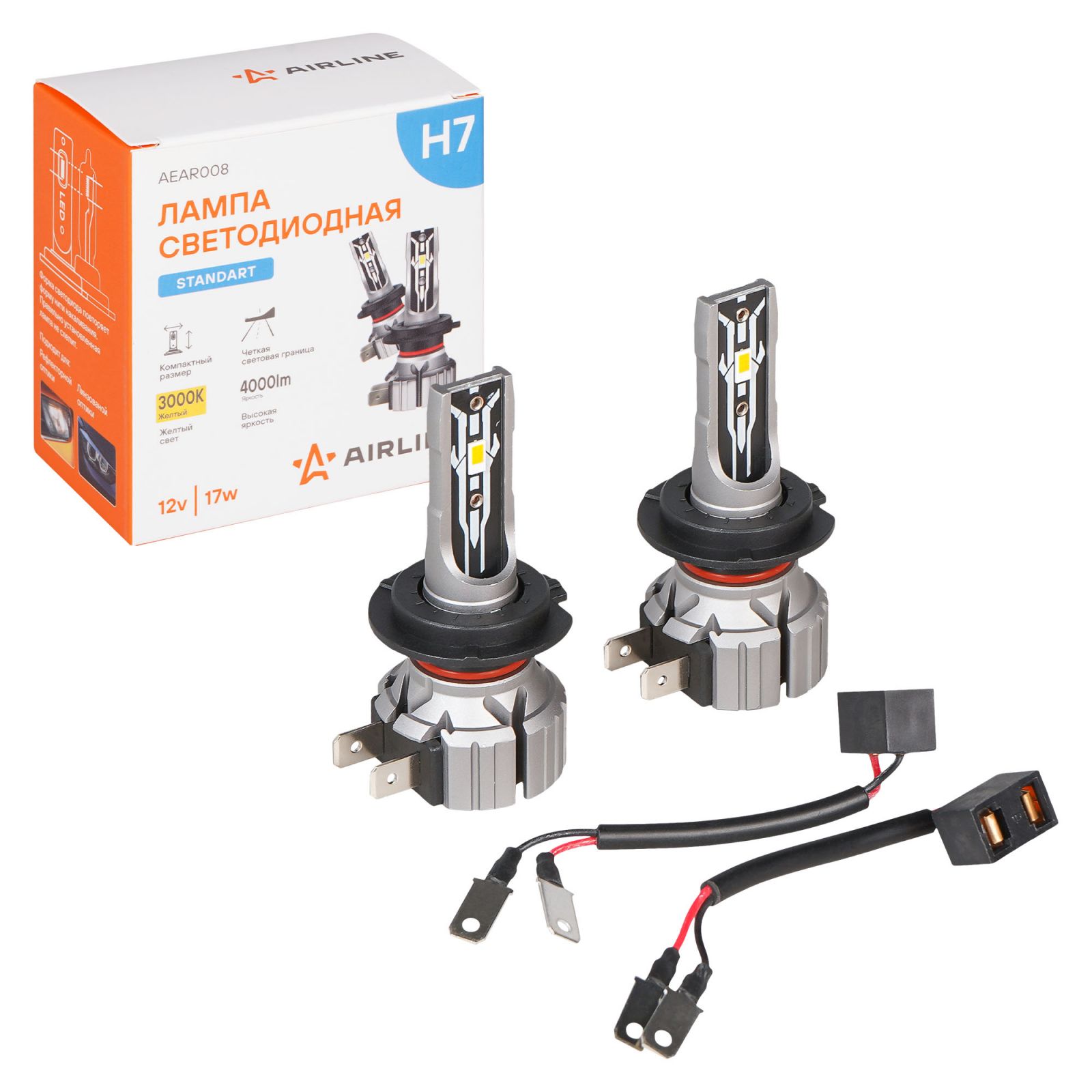 Лампа светодиод. H7 STANDARD, 17Вт, 4000Лм (2000Лм x 2), 3000К, 12В, кмпл. 2 шт. (AEAR008)