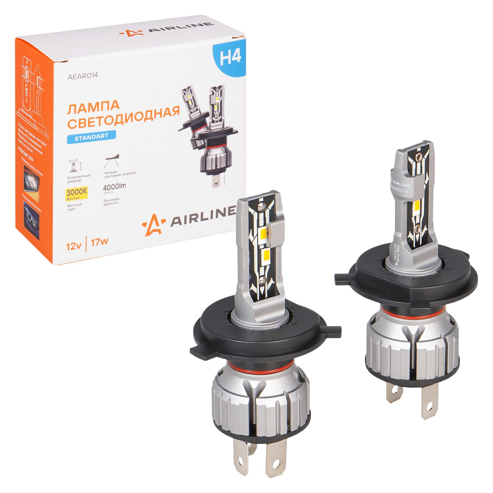 Лампа светодиод. H4 STANDARD, 17Вт, 4000Лм (2000Лм x 2), 3000К, 12В, кмпл. 2 шт. (AEAR014)