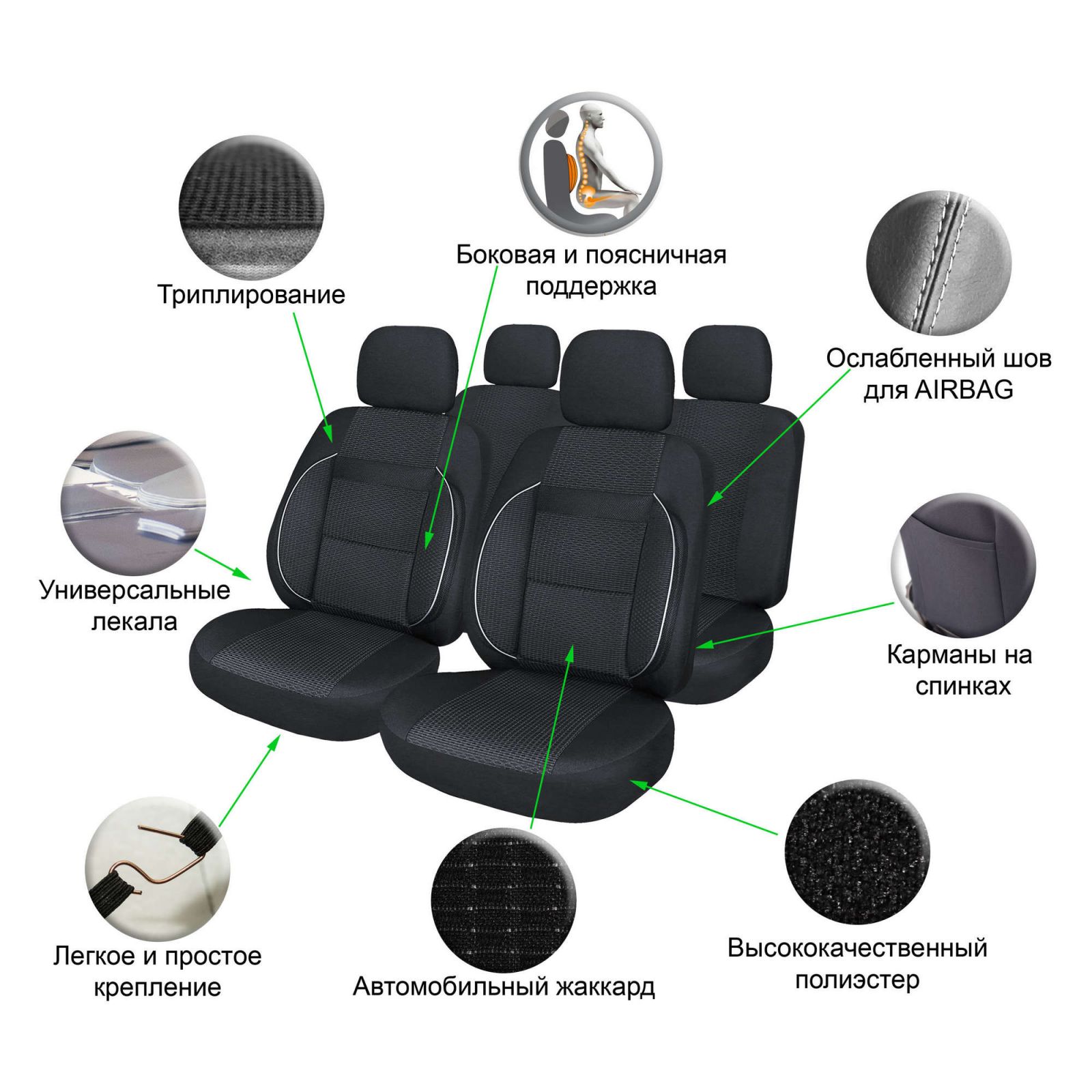 Чехлы для сидений универсал. "RS-7k+", передн./задн.(8 предм.), влагозащит. полиэстер, черные (ADCS003)
