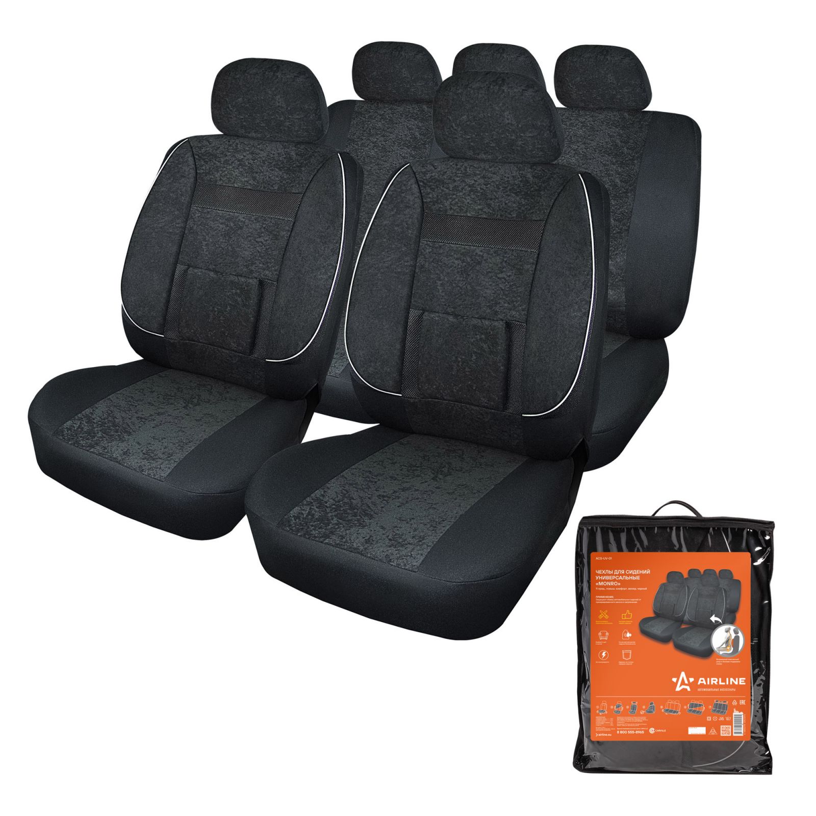 Чехлы для сидений универсальные "MONRO", 11 пред., повыш. комфорт, велюр, черн. (ACS-UV-01)