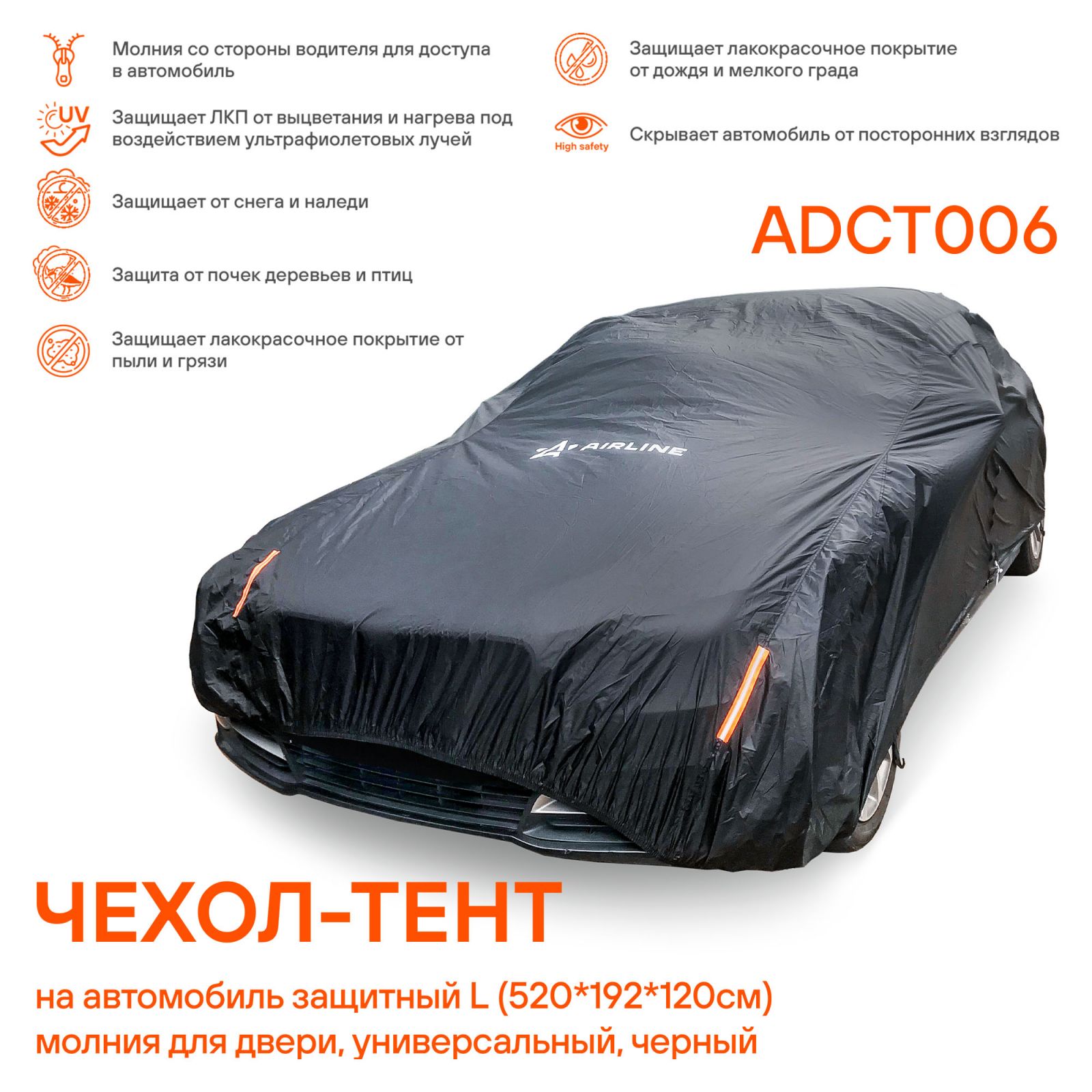 Чехол-тент на автомобиль защитный L (520х192х120см) молния для двери, универсал., черный (ADCT006)