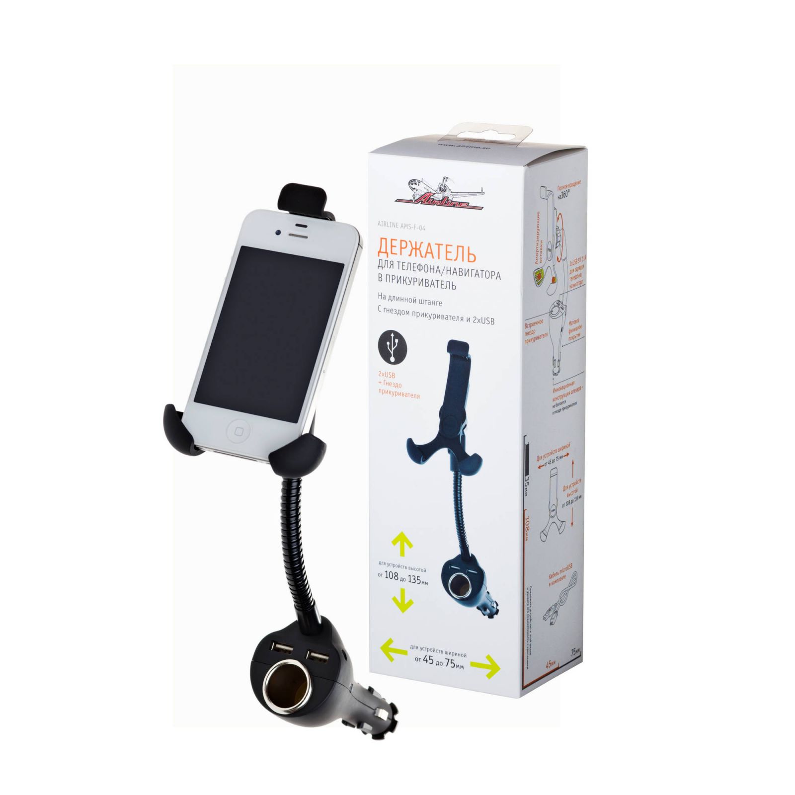 Держатель для телефона в прикуриватель на длинной штанге с гнездом прикуривателя и 2xUSB (AMS-F-04)