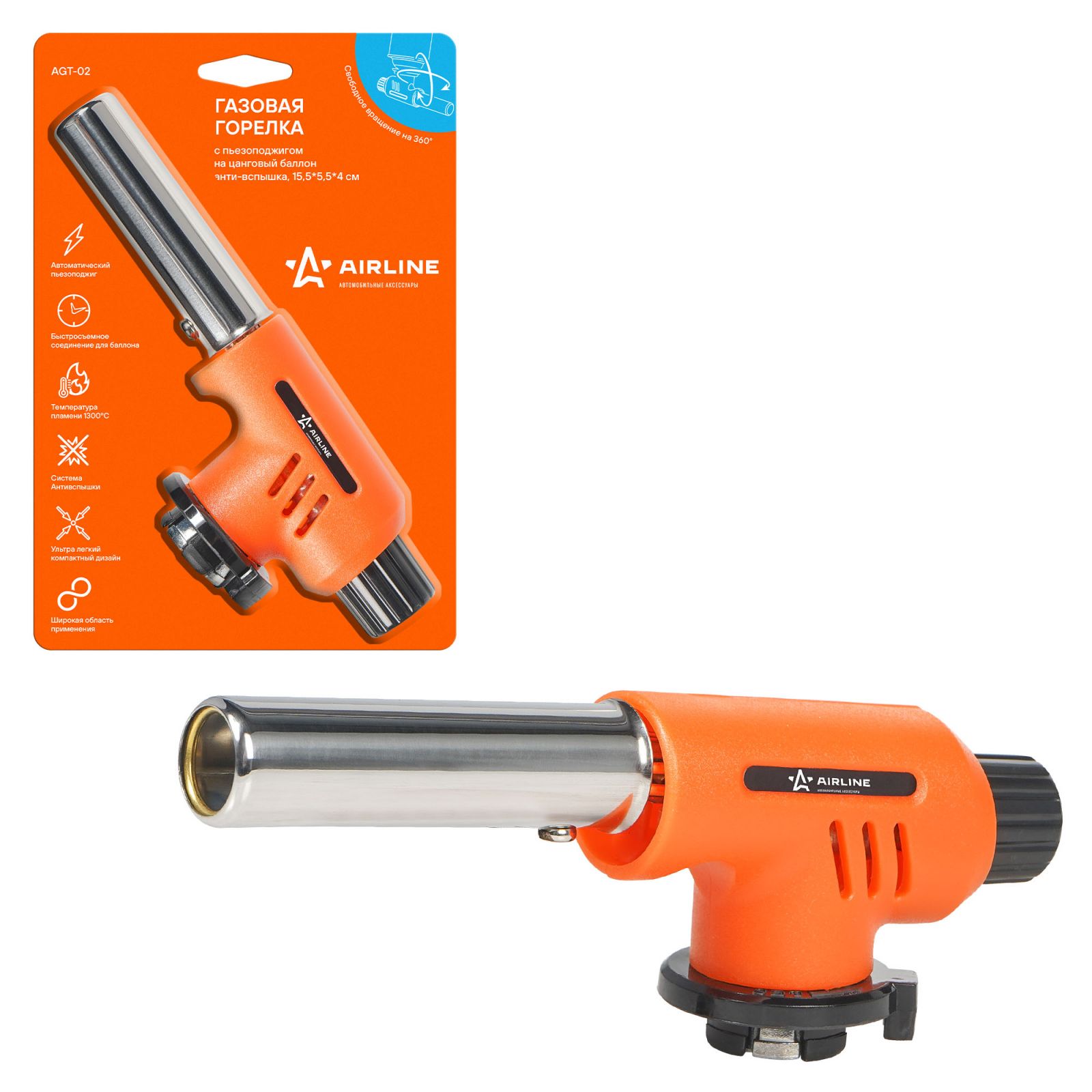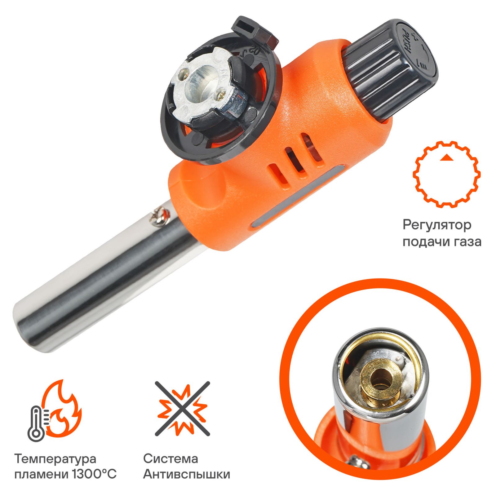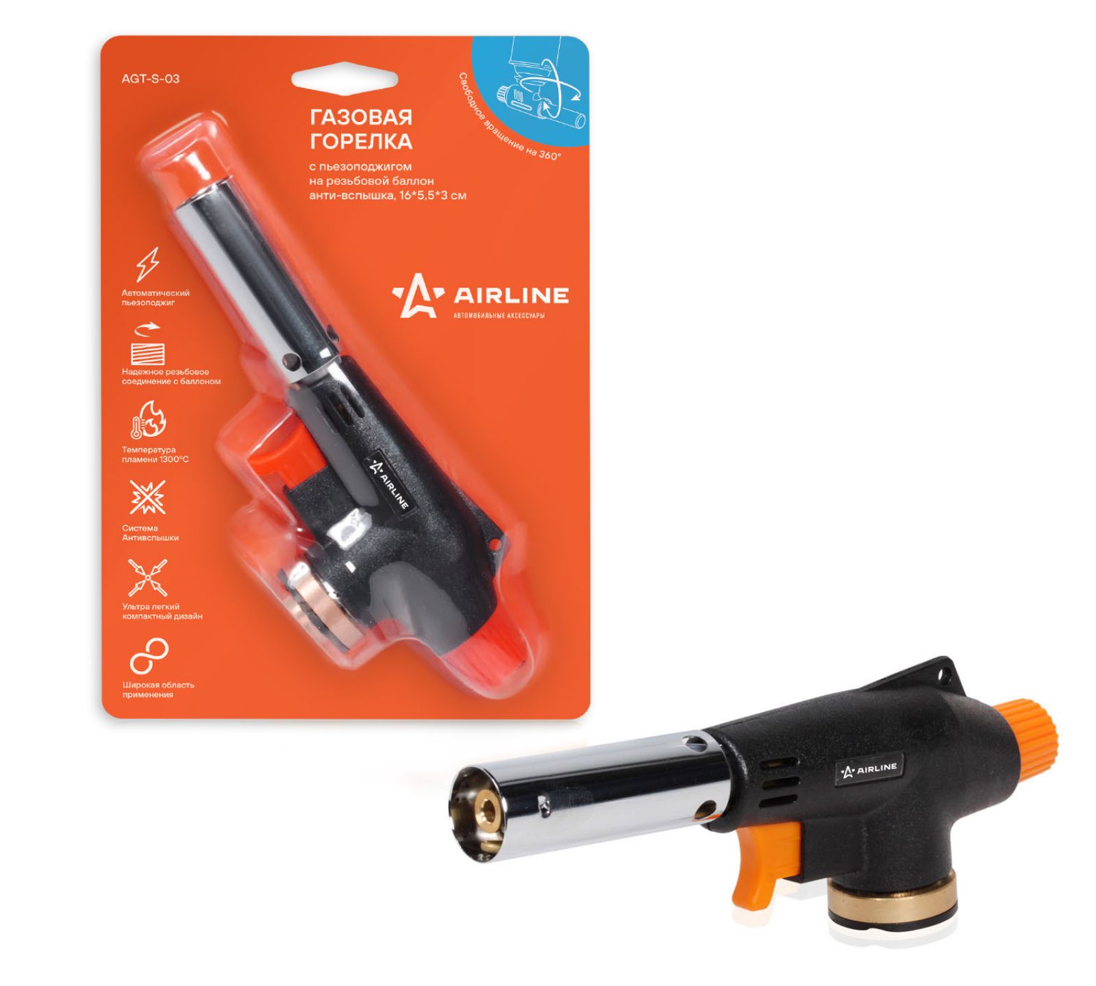 Горелка газовая на резьбовой баллон, пьезоподжиг, анти-вспышка, 16*5,5*3 см (AGT-S-03)