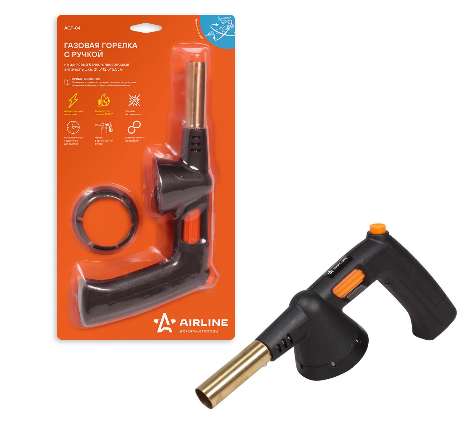 Горелка газовая на резьбовой баллон,пьезоподжиг, анти-вспышка, ручка, 21,5*12,5*5,5 см (AGT-S-04)