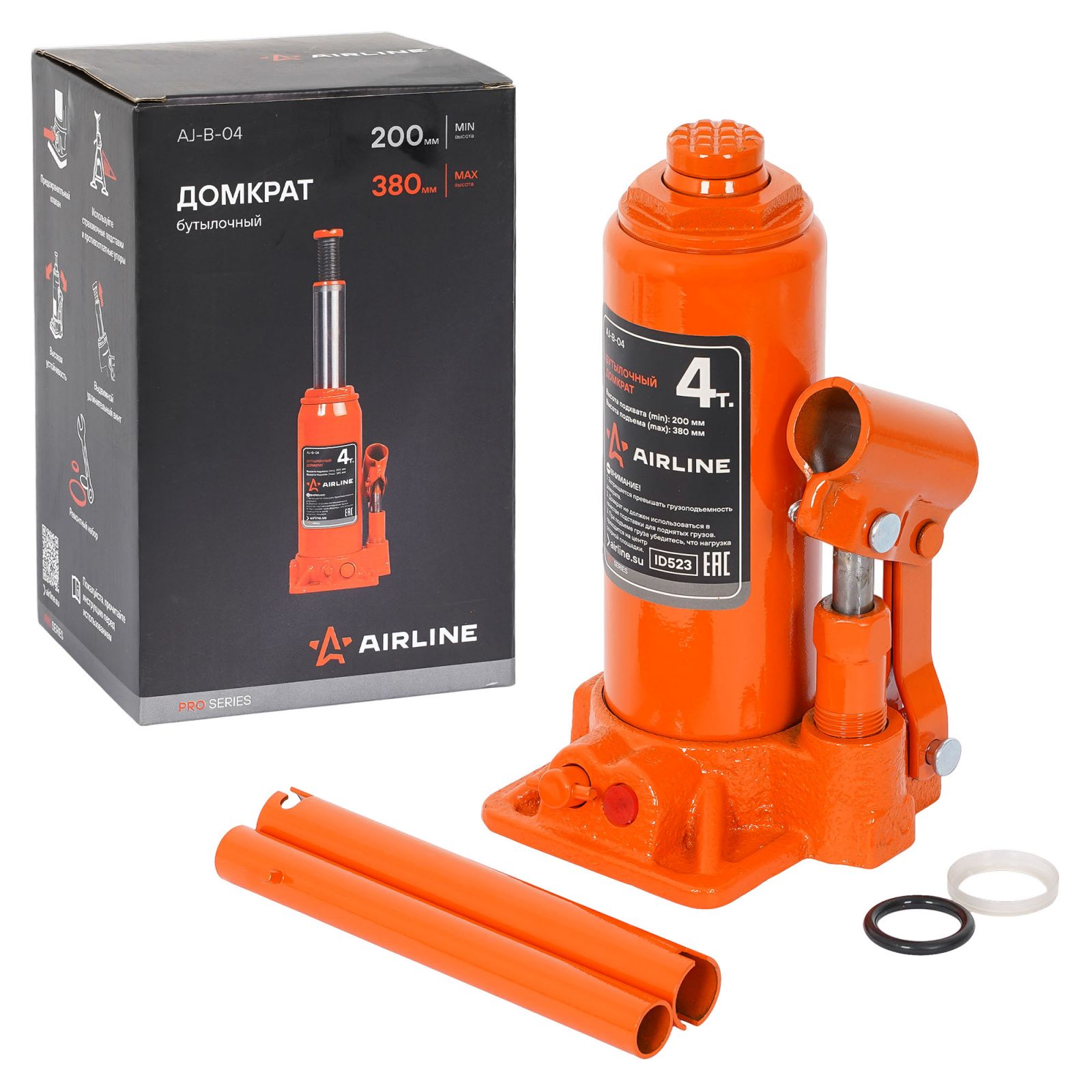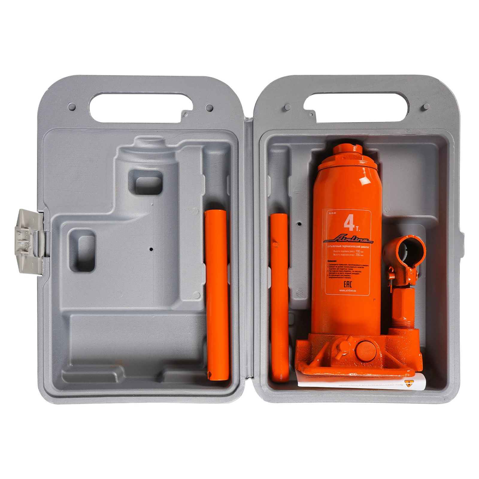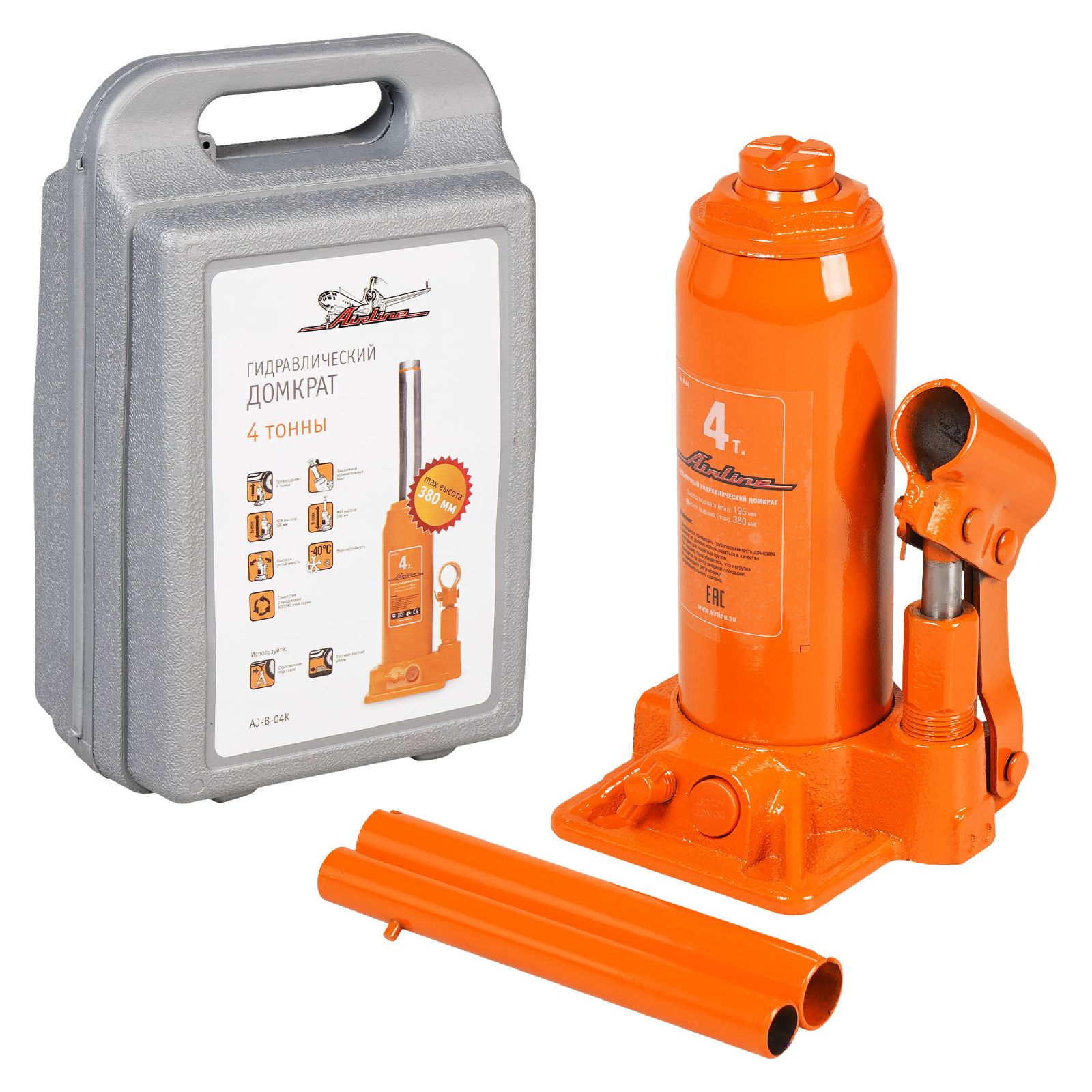 Домкрат бутылочный 4т 200-380мм, кейс (AJ-B-04K)