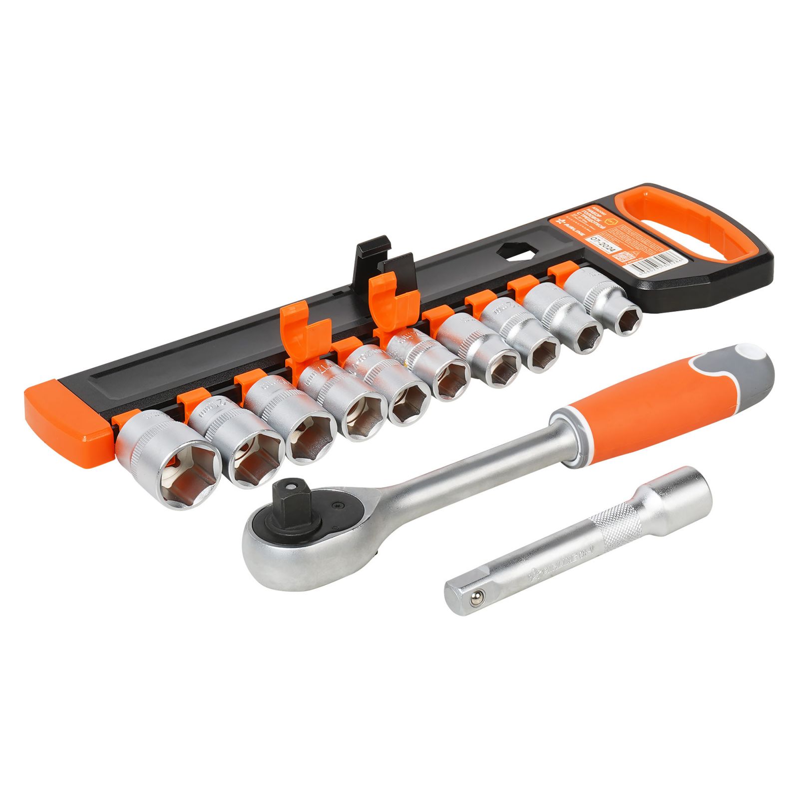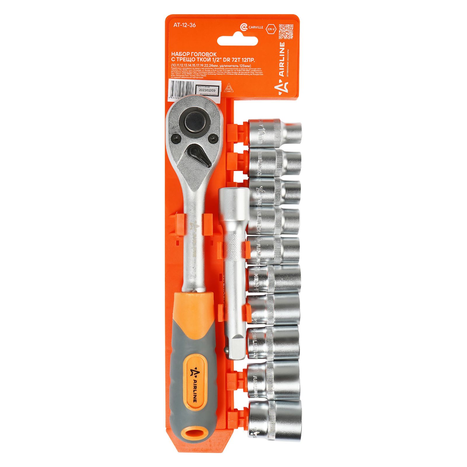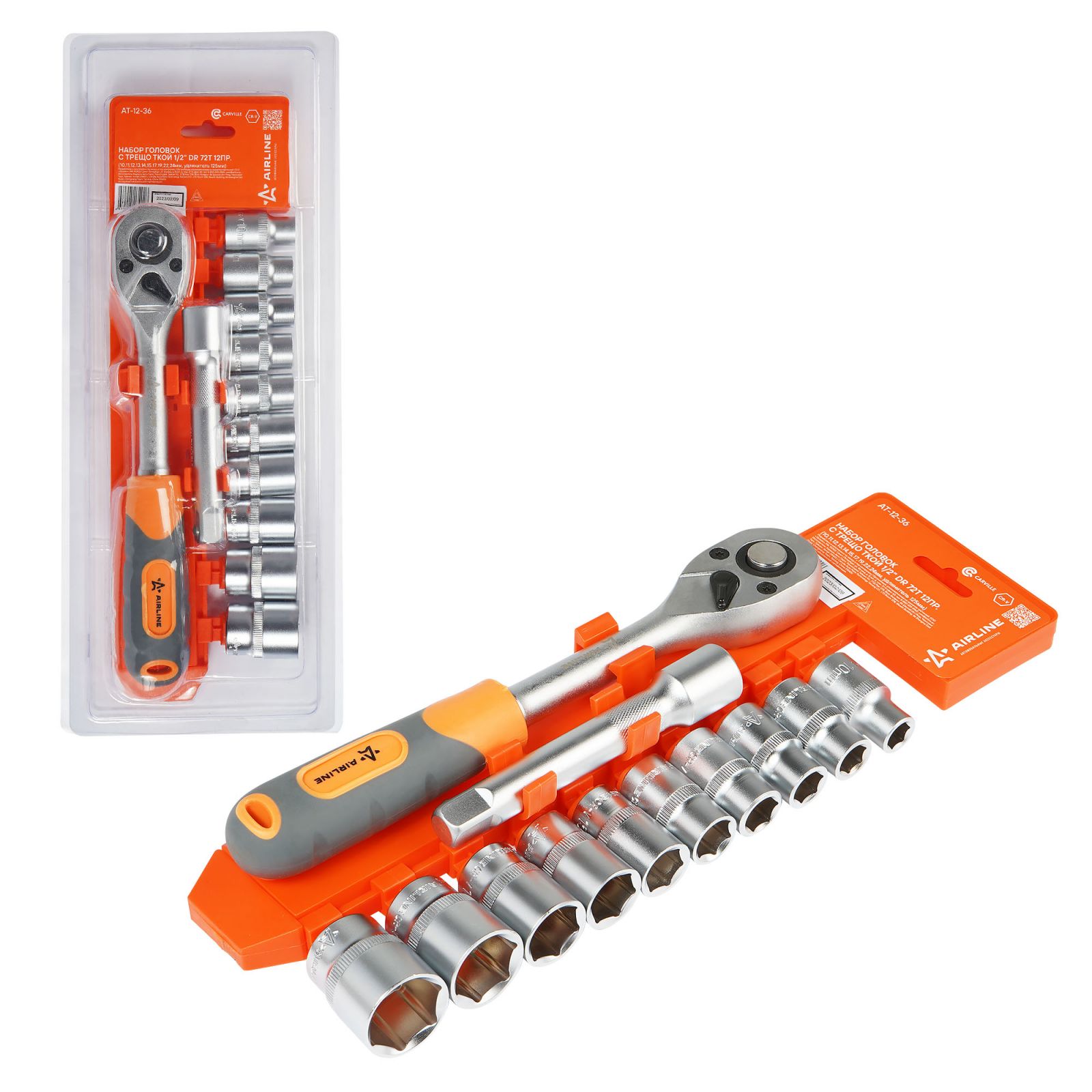 Набор головок 1/2" шестигранных с трещоткой 72Т 12пр. (10-24мм, удлинитель 125мм) (AT-12-36)