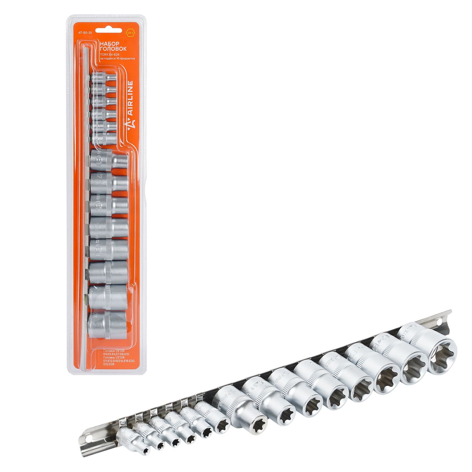 Набор головок 1/2" и 1/4" TORX 14пр. (E4-E24), пласт.подвес (AT-BS-35)