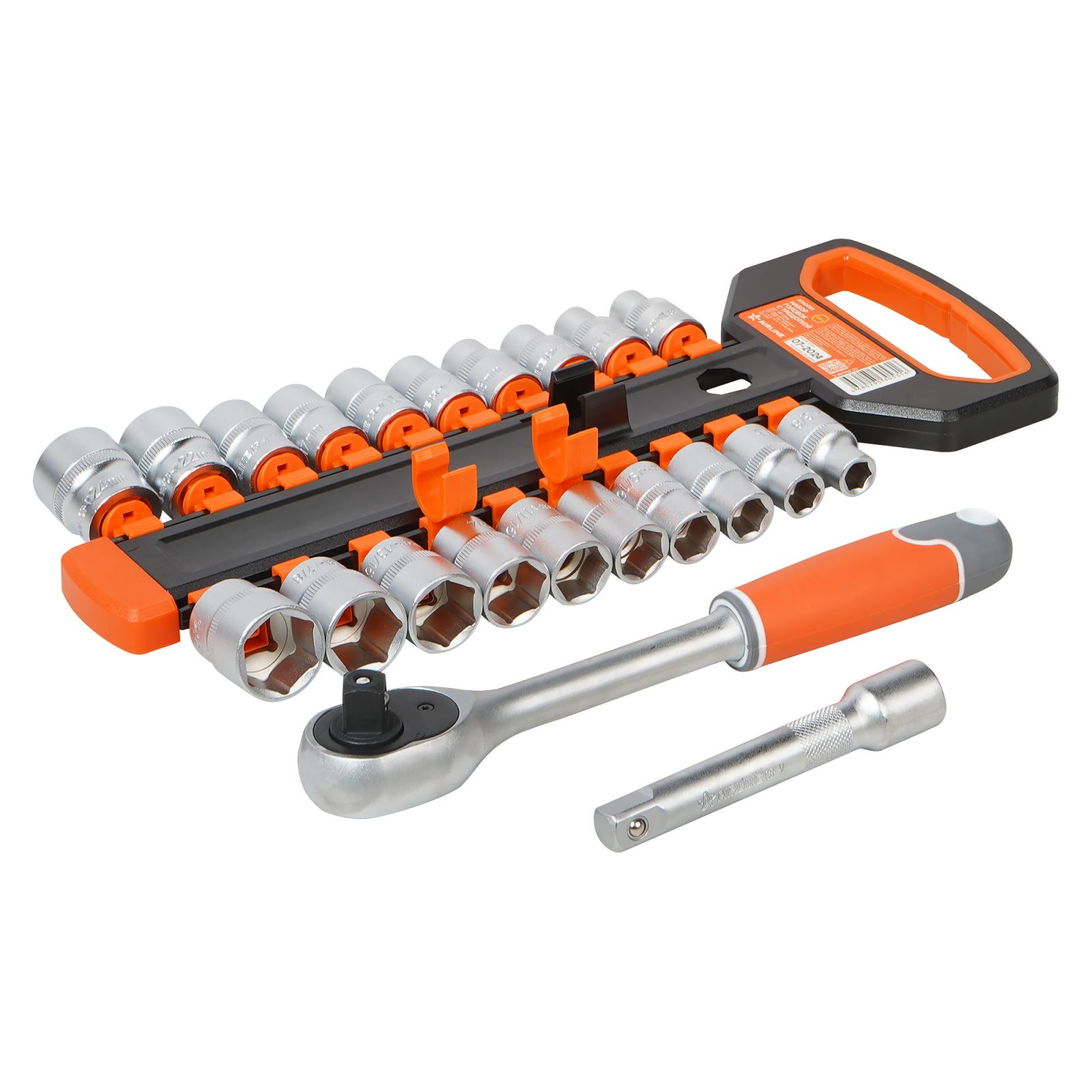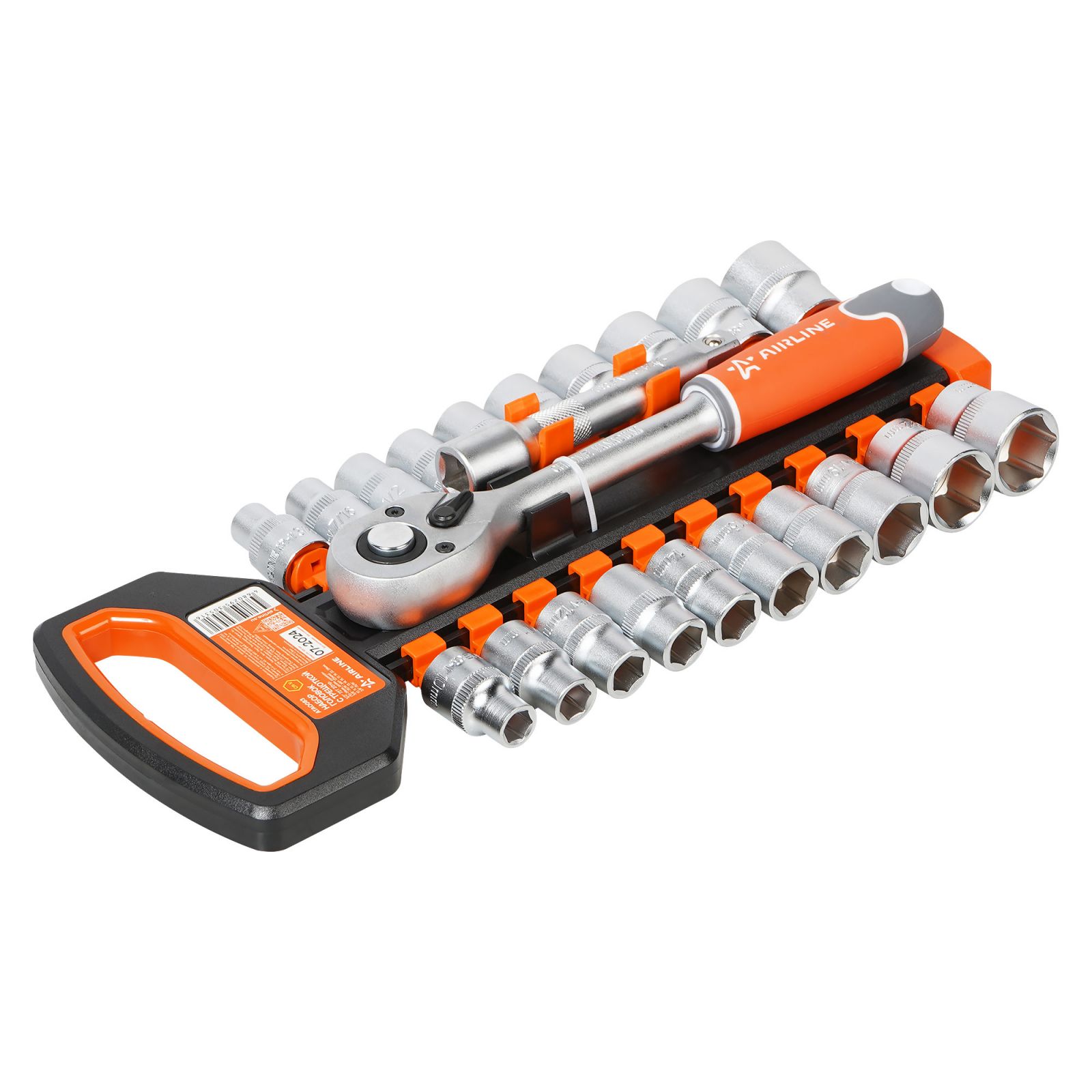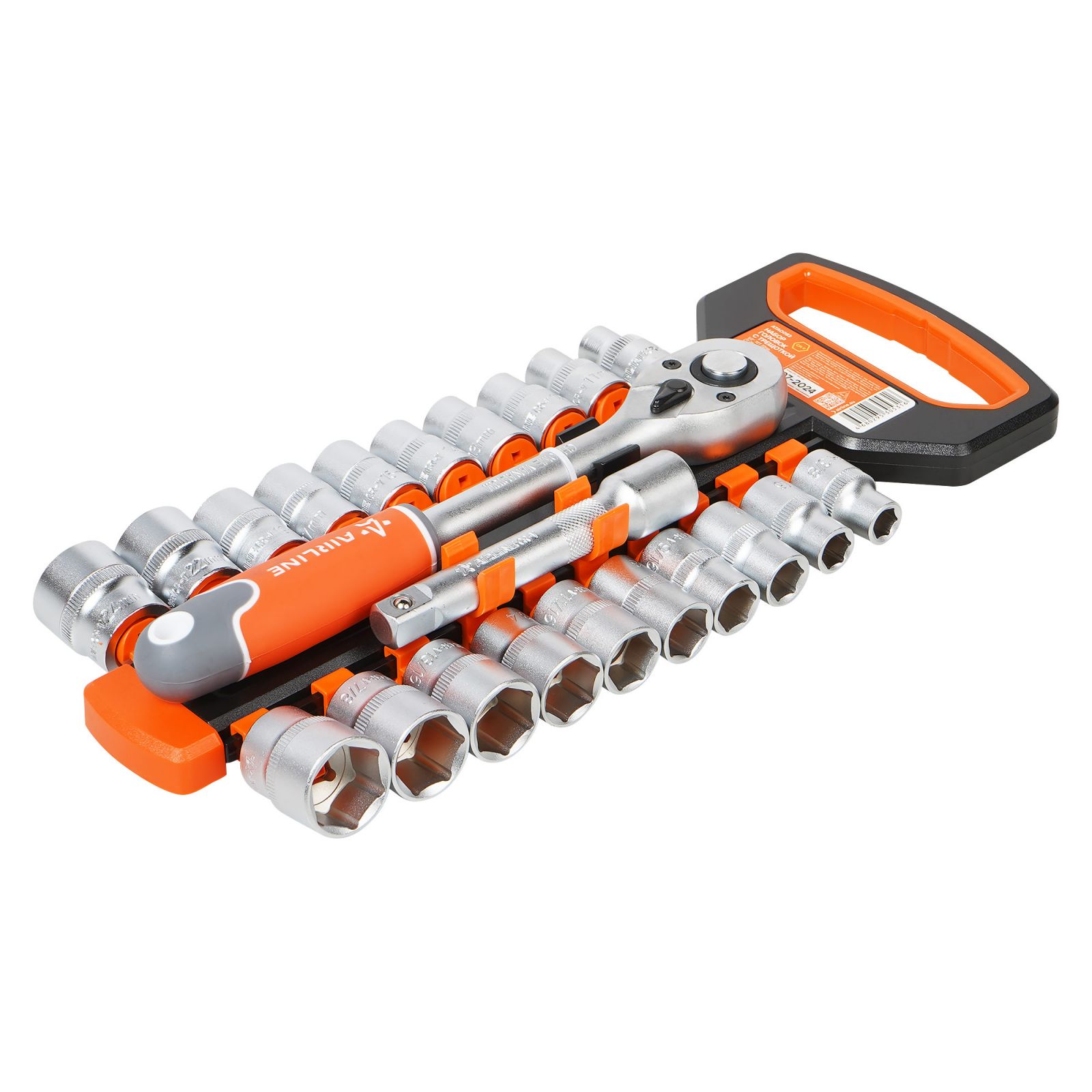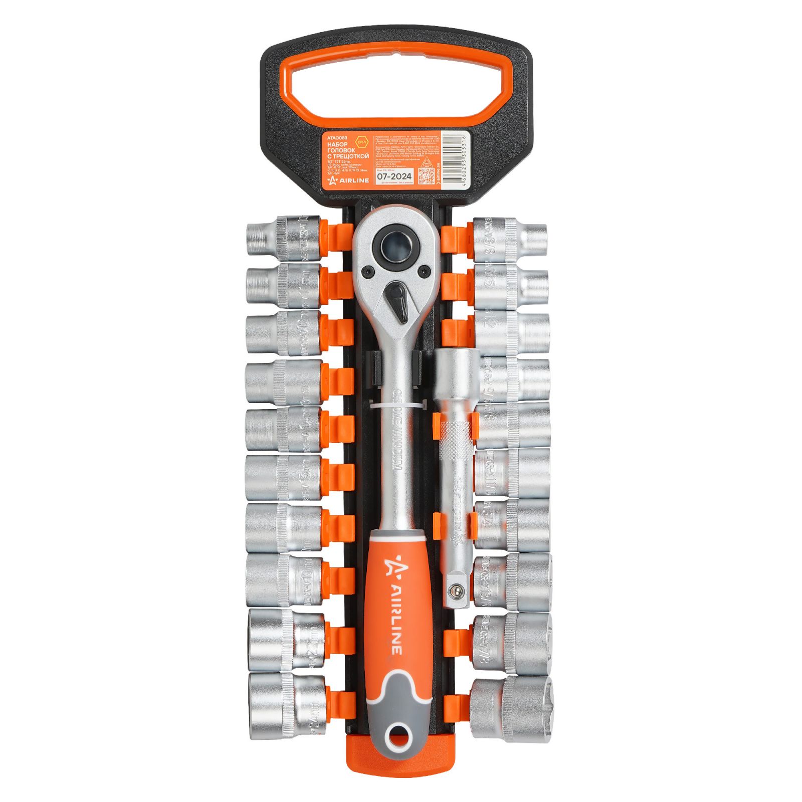 Набор головок 1/2" шестигранных с трещоткой 72Т 22пр. (10-24мм, дюйм. размеры 3/8"-15/16", удл. 125мм) (ATAO083)
