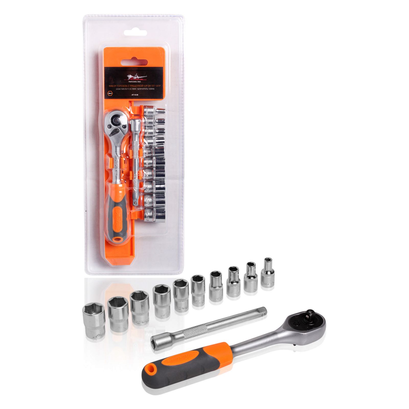 Набор головок 1/4" с трещоткой 72Т 12пр. (4-13мм, удлинитель 100мм) (AT-12-26)