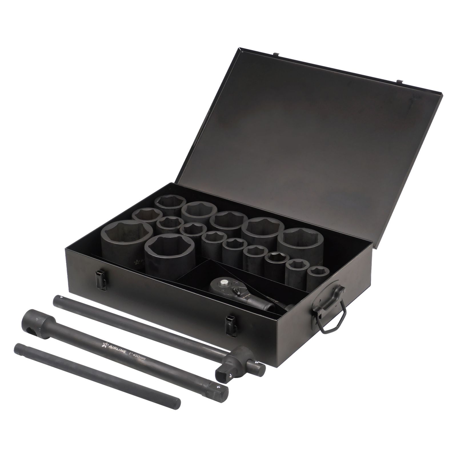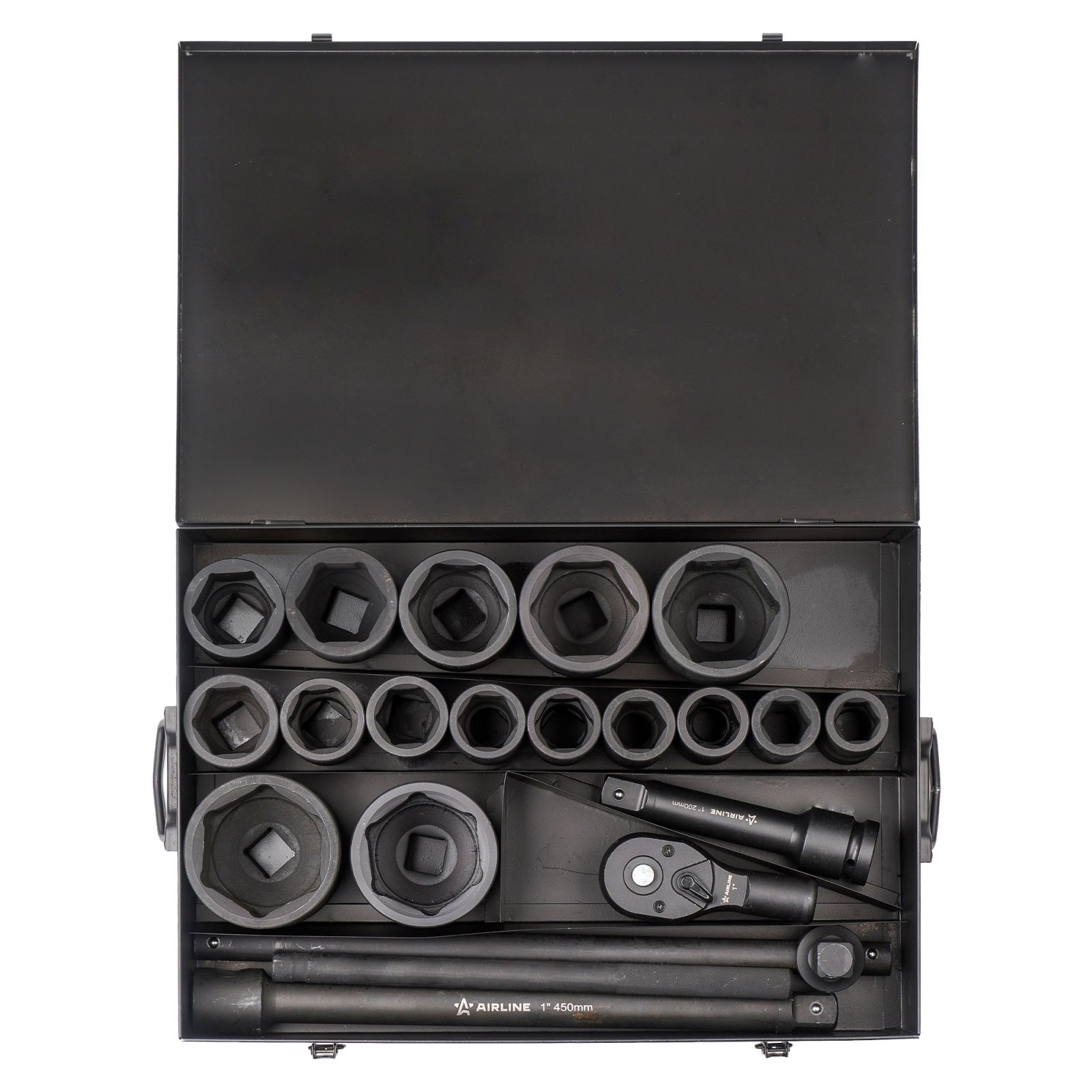 Набор головок ударных 1"DR L=90мм, 20 пр. (27-80мм, Т-вороток, трещотка, удл.) металл.кейс (ATAS068)