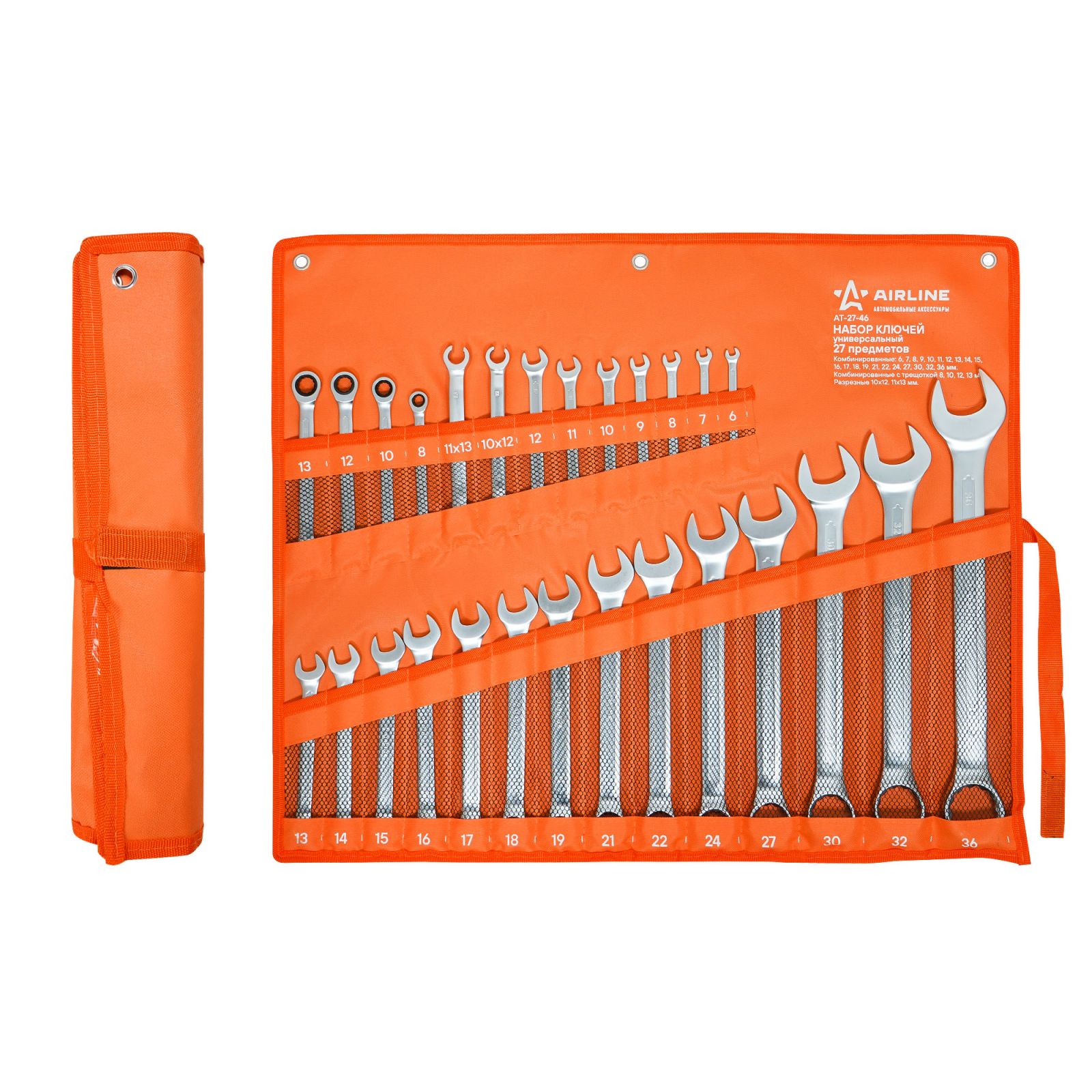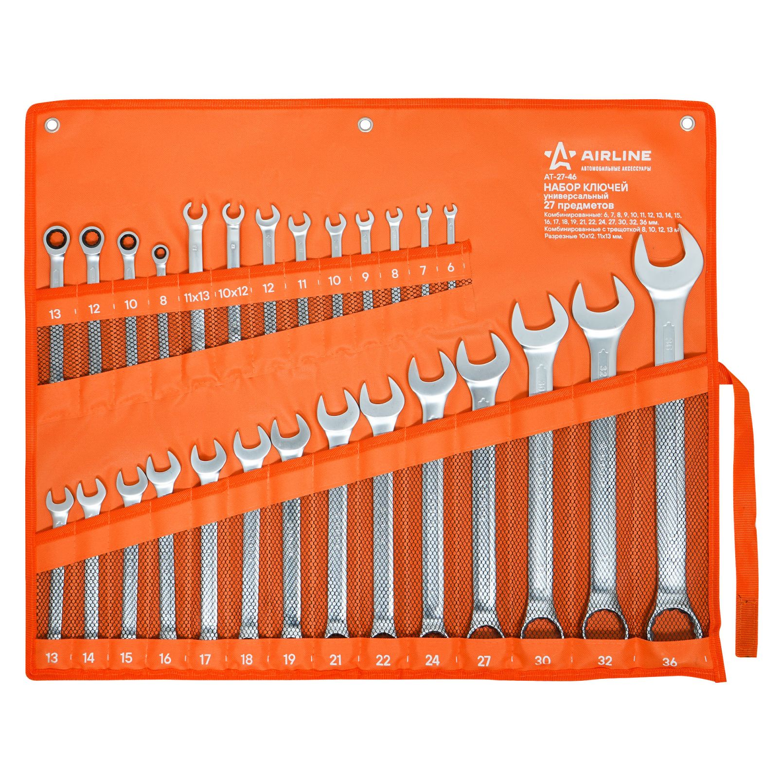 Набор ключей универсальный PRO 27пр. (комб. 6-36мм, комб. с трещоткой 8,10,12,13мм, разрезные 10x12,11x13мм) сумка (AT-27-46)