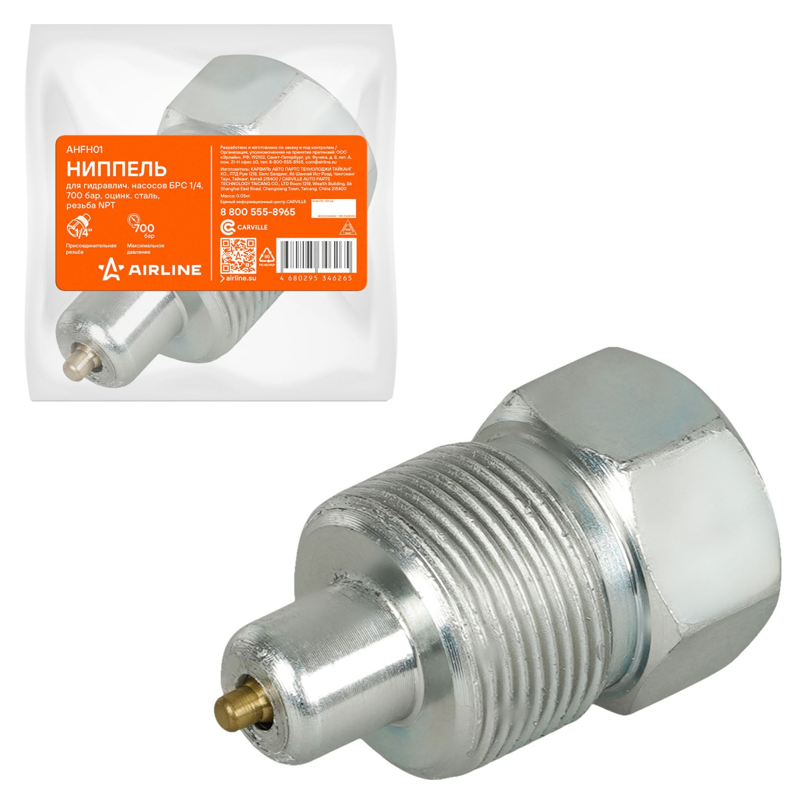 Ниппель для гидравлич. насосов БРС 1/4, 700 бар, оцинк. сталь, резьба NPT (AHFH01)