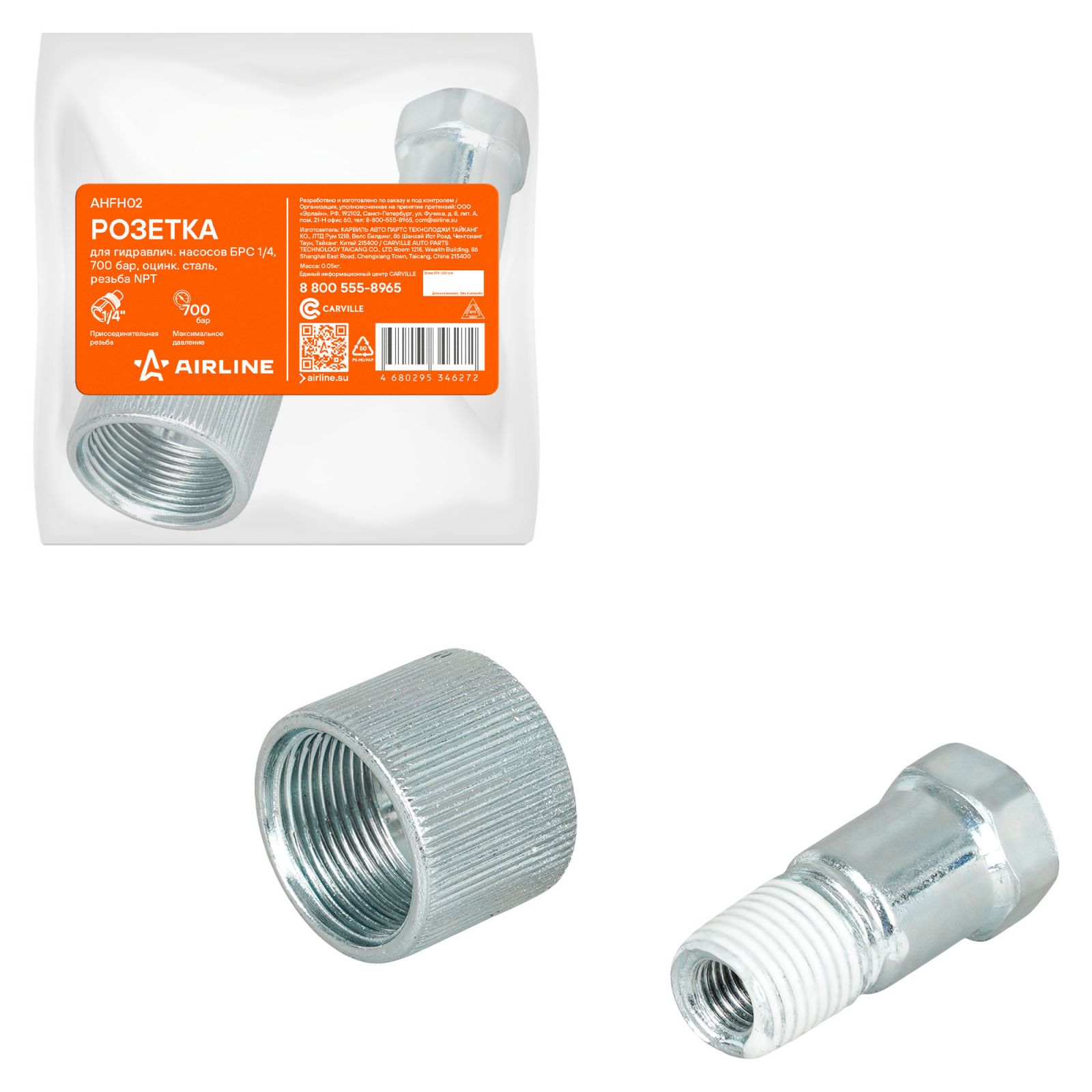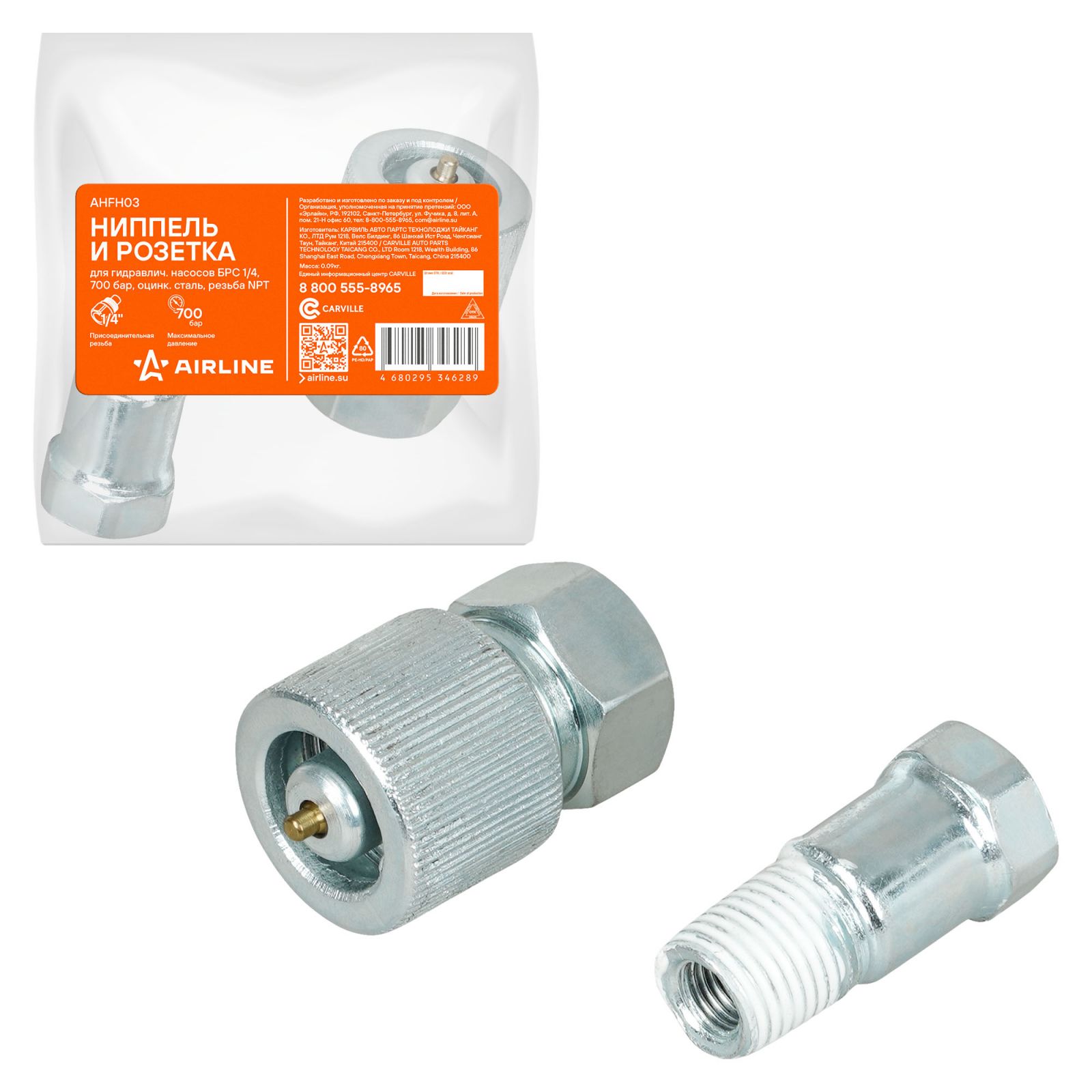 Ниппель и розетка для гидравлич. насосов БРС 1/4, 700 бар, оцинк.сталь, резьба NPT (AHFH03)