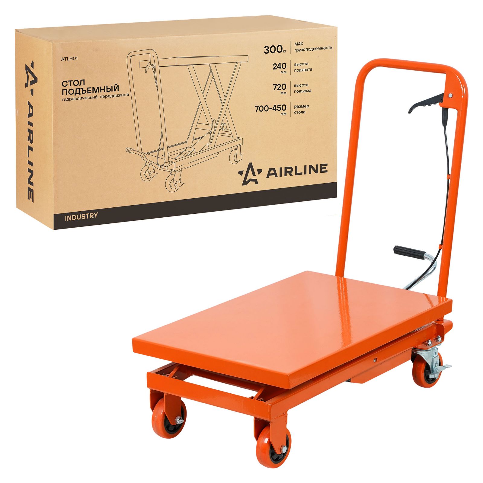 Стол подъемный гидравлический г/п 300кг 240-720мм передвижной, платформа 700x450мм (ATLH01)