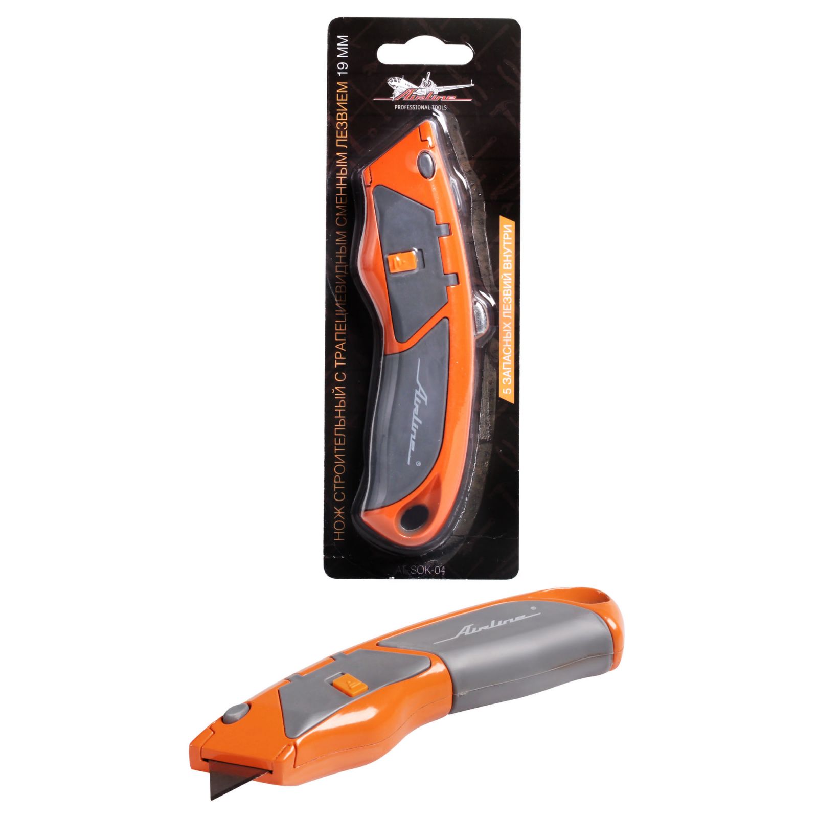Нож строительный с трапециевидным сменным лезвием 19мм (AT-SOK-04)