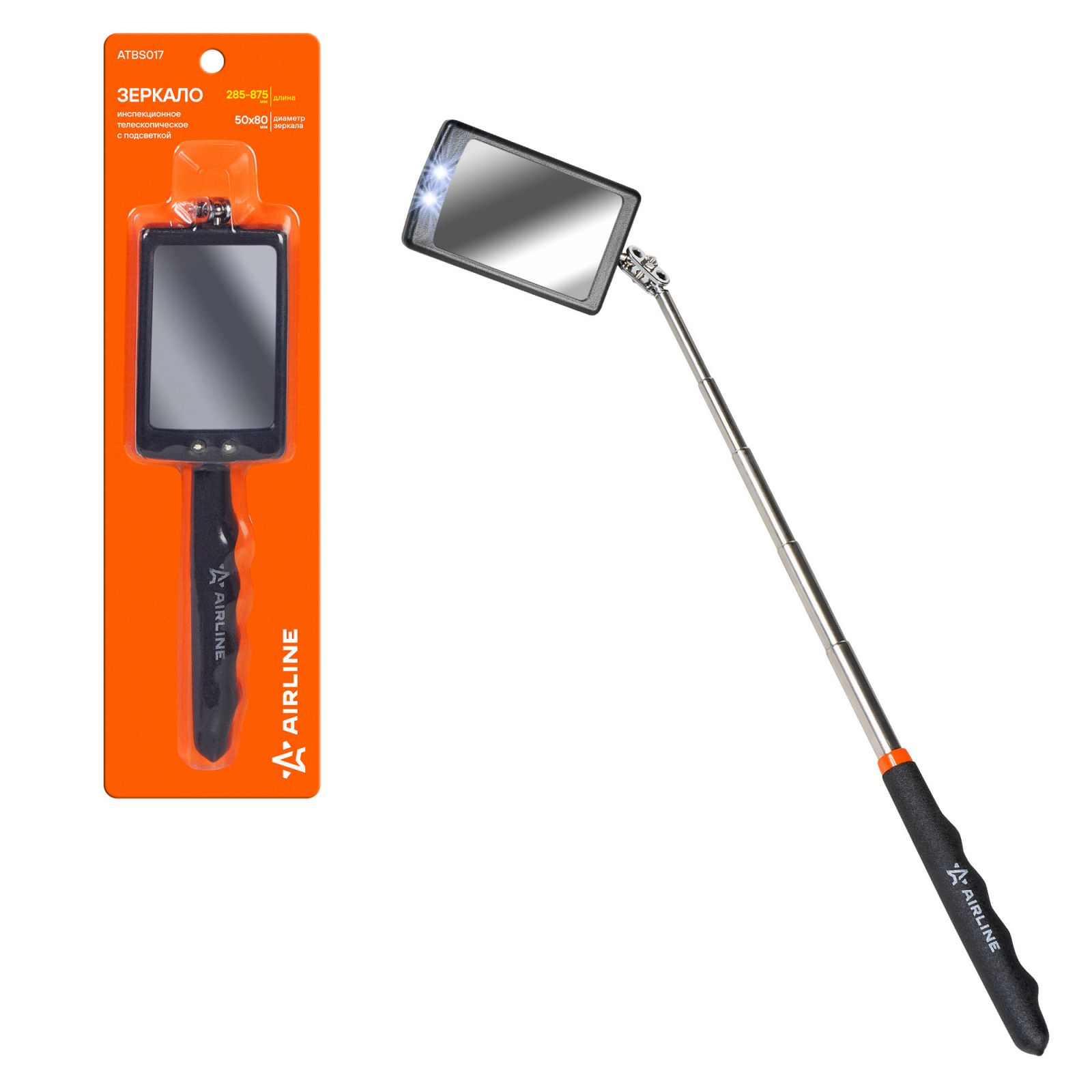 Зеркало инспекционное телескопическое с подсветкой L=285-875мм, 50х80мм (ATBS017)