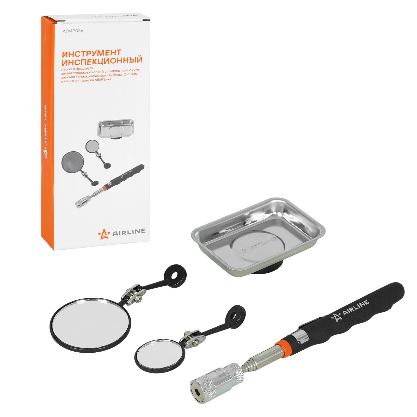 Инструмент инспекционный, набор 4пр. (захват телеск. с подсвет. 2.2кгс, зеркало телеск. D35, 57мм 2шт., магнит.тарелка 64х93мм) (ATMP036)