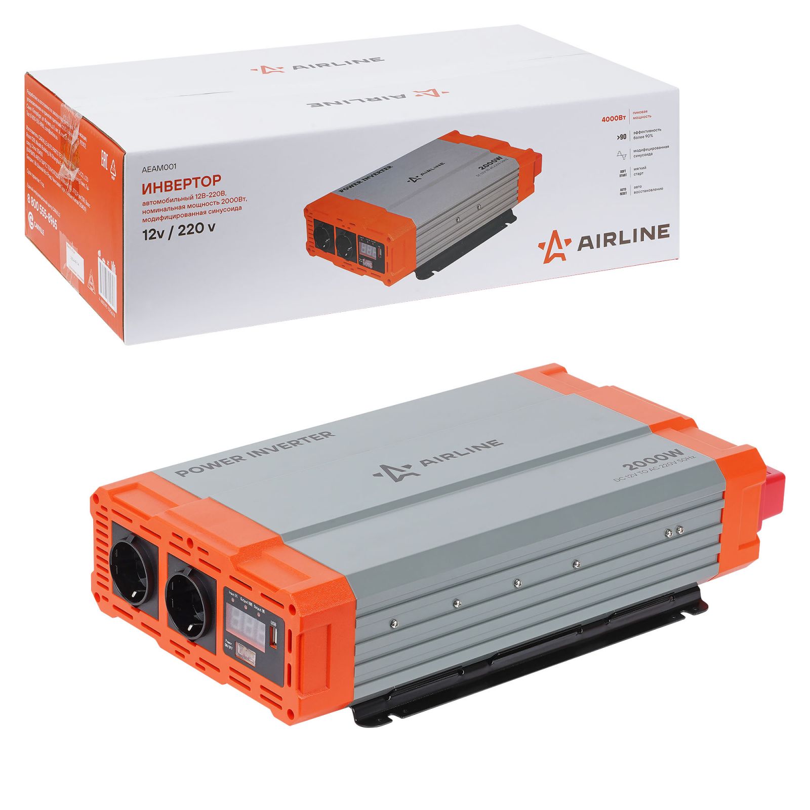Инвертор автомобильный 12В-220В, 2000 Вт (AEAM001)
