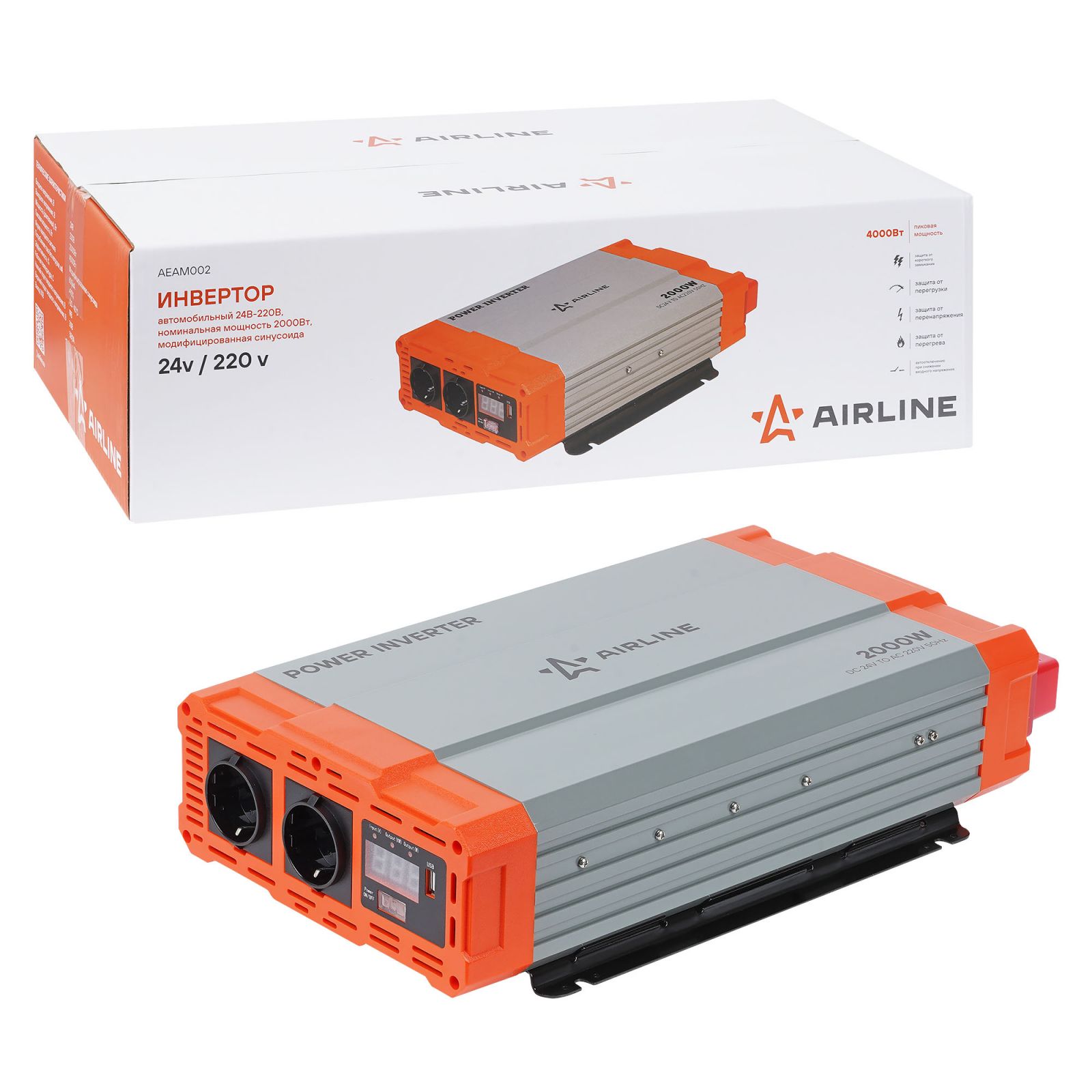 Инвертор автомобильный 24В-220В, 2000 Вт (AEAM002)