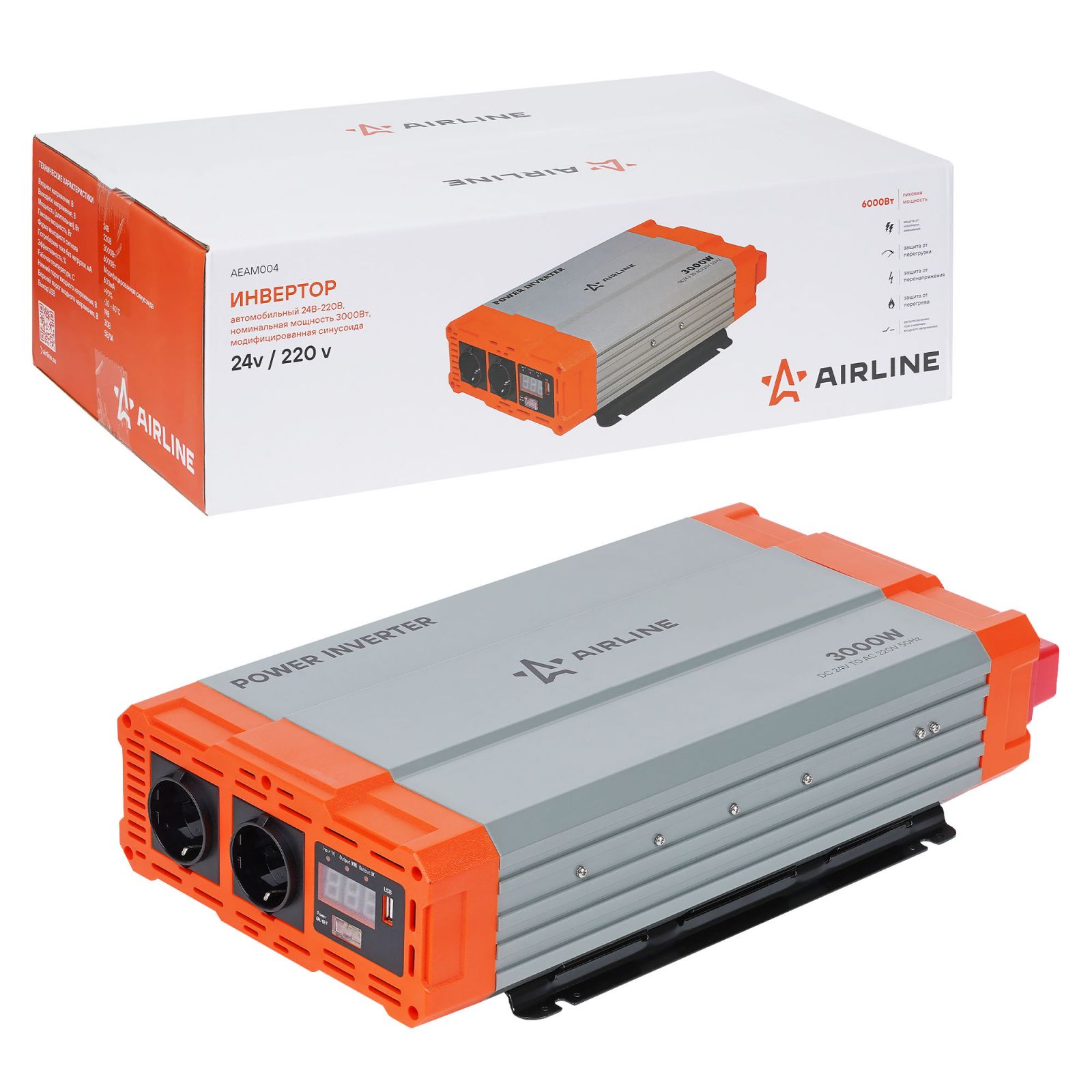 Инвертор автомобильный 24В-220В, 3000 Вт (AEAM004)
