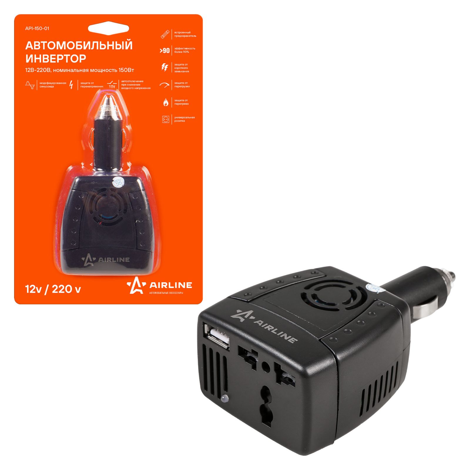 Инвертор автомобильный 12В-220В, 150 Вт (API-150-01)