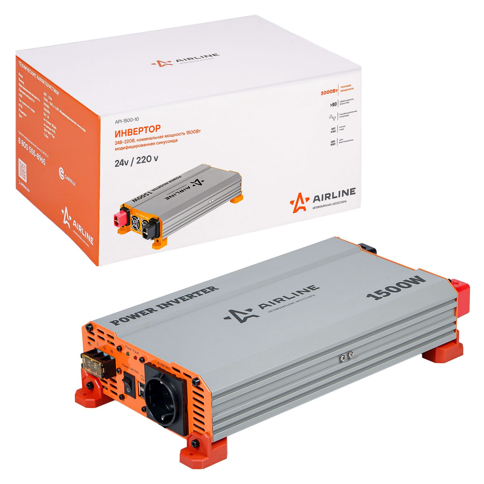 Инвертор автомобильный 24В-220В, 1500 Вт (API-1500-10)