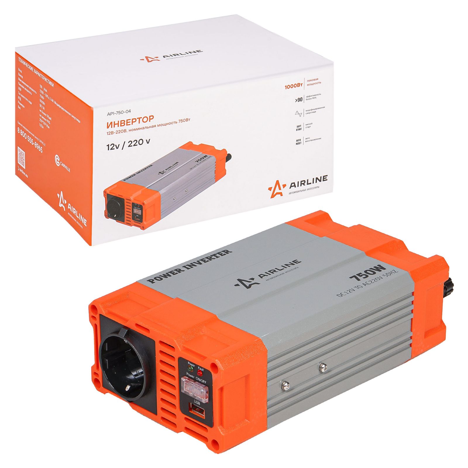 Инвертор автомобильный 12В-220В, 750 Вт (API-750-04)