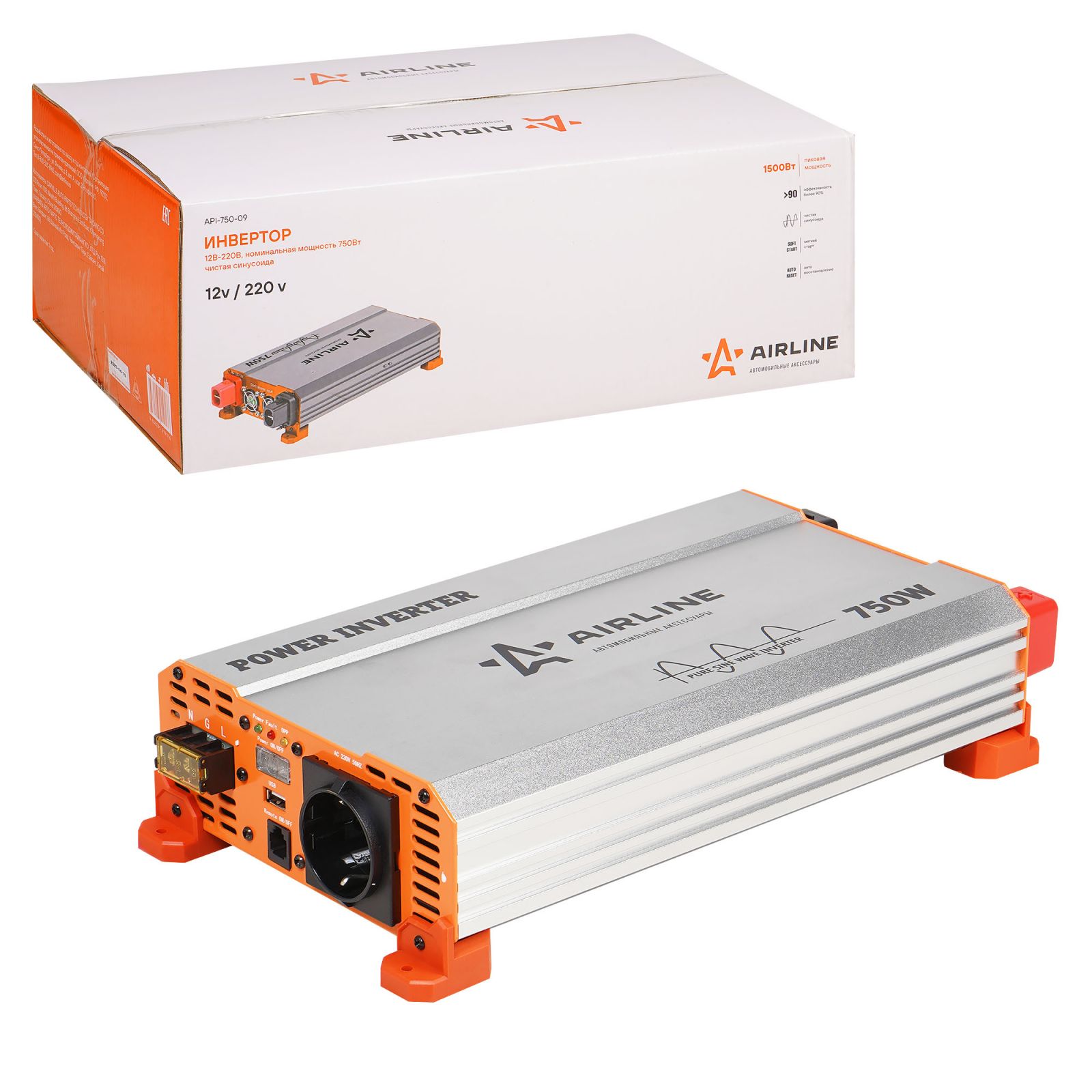 Инвертор автомобильный 12В-220В, 750 Вт чистый синус (API-750-09)