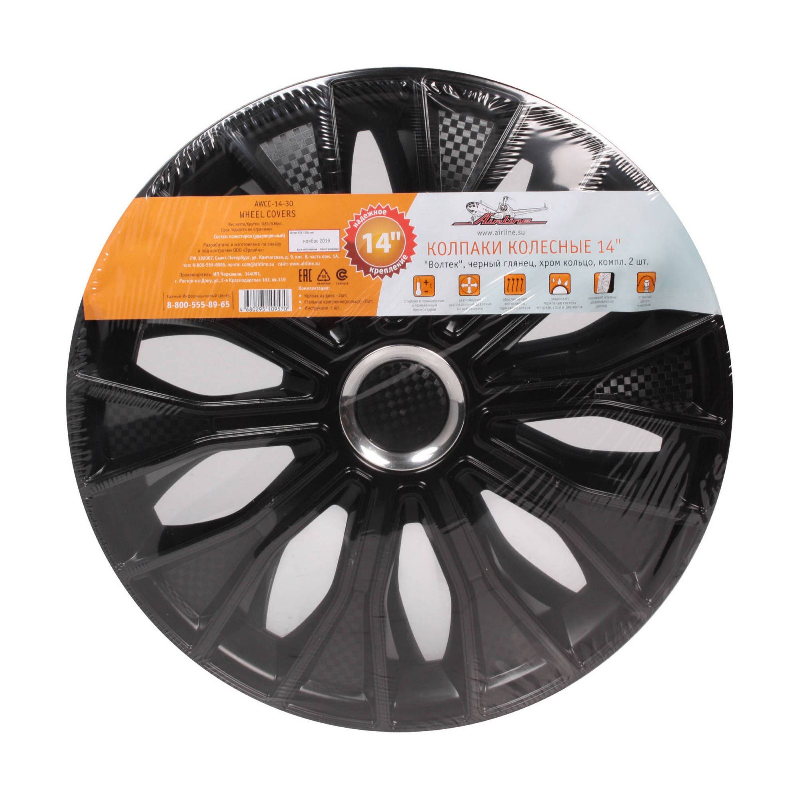 Колпаки колесные 14" "Волтек", черный глянец, хром кольцо, компл. 2 шт. (AWCC-14-30)