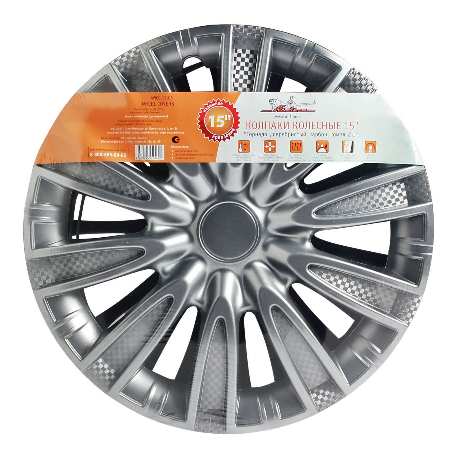 Колпаки колесные 15" "Торнадо", серебристый, карбон, компл. 2 шт. (AWCC-15-06)
