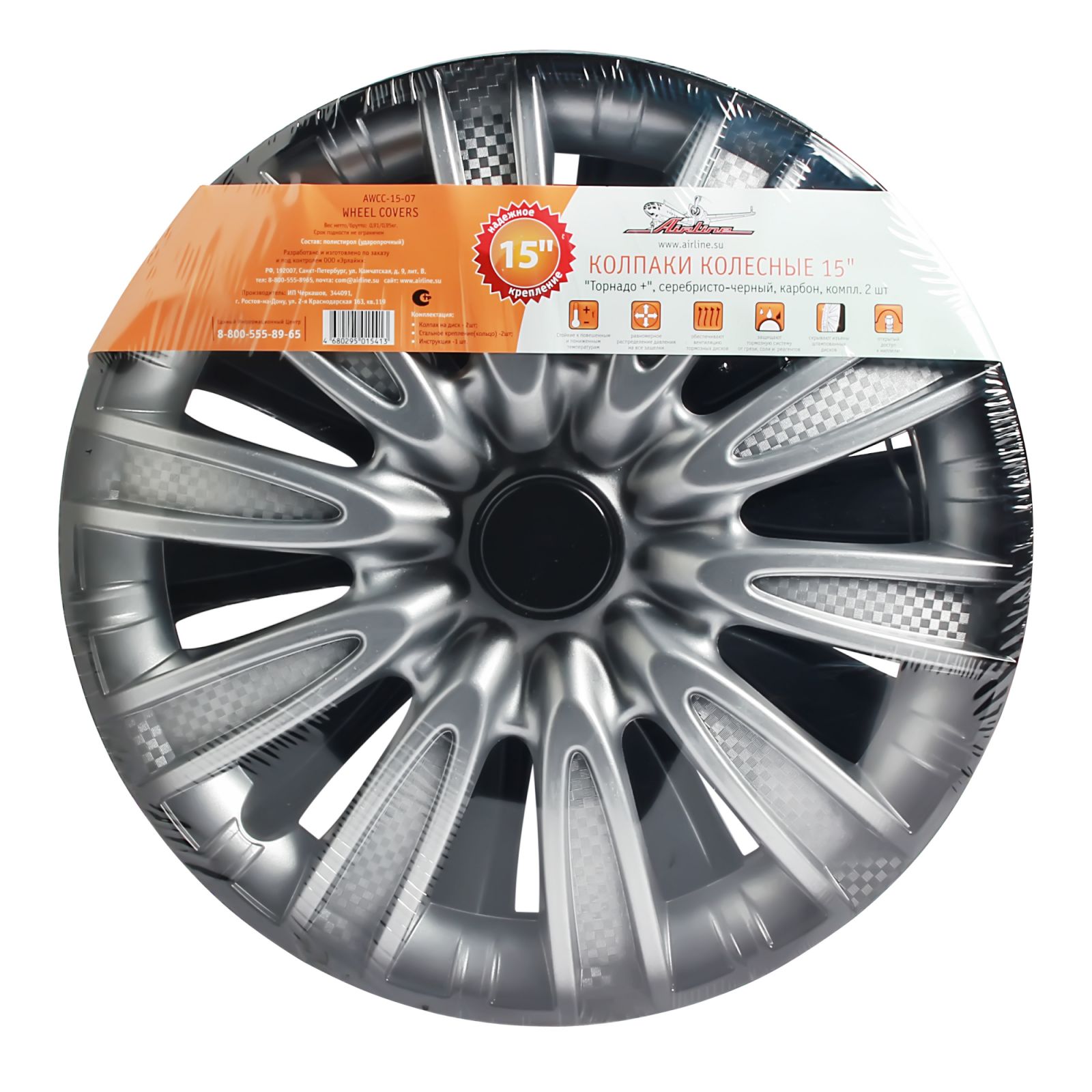 Колпаки колесные 15" "Торнадо +", серебристо-черный, карбон, компл. 2 шт. (AWCC-15-07)