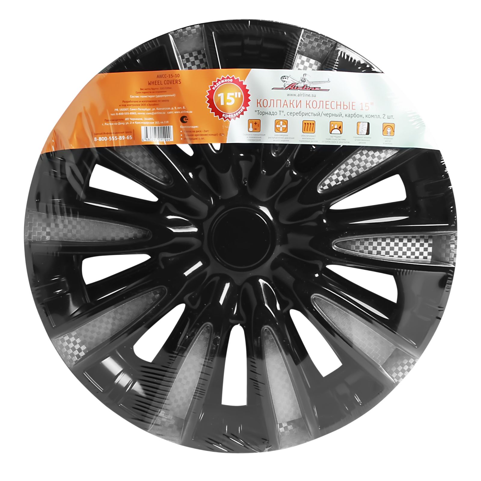 Колпаки колесные 15" "Торнадо Т", серебристый/черный, карбон, компл. 2 шт. (AWCC-15-10)