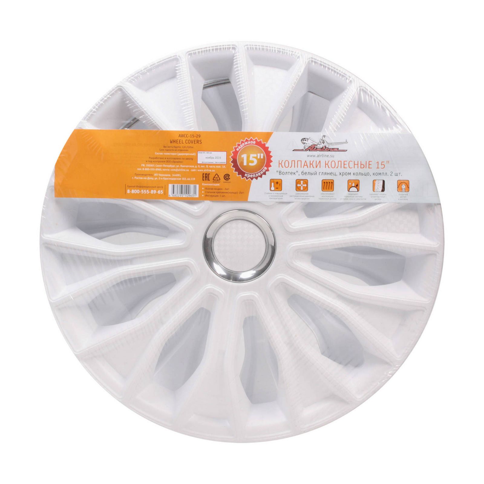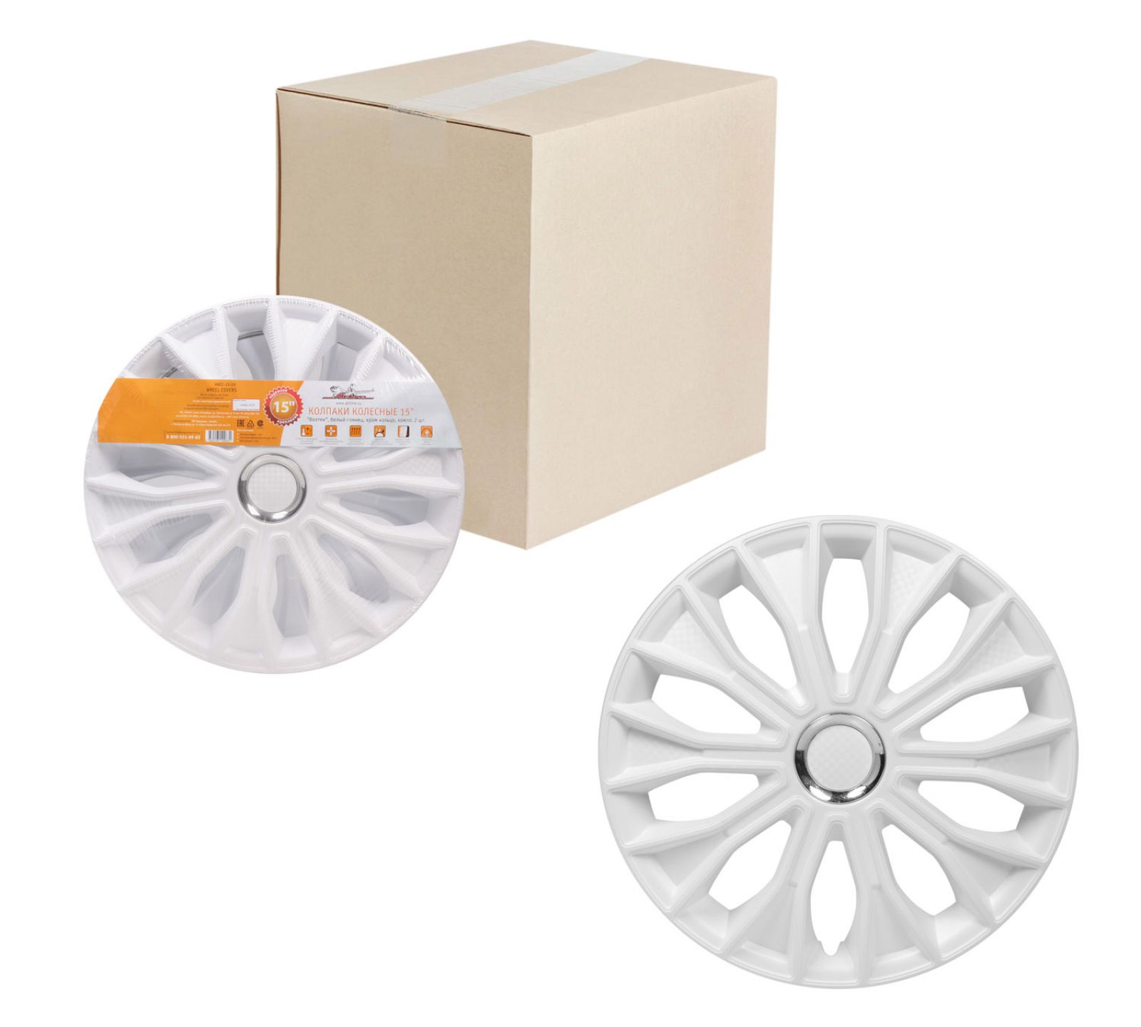 Колпаки колесные 15" "Волтек", белый глянец, хром кольцо, компл. 2 шт. (AWCC-15-29)