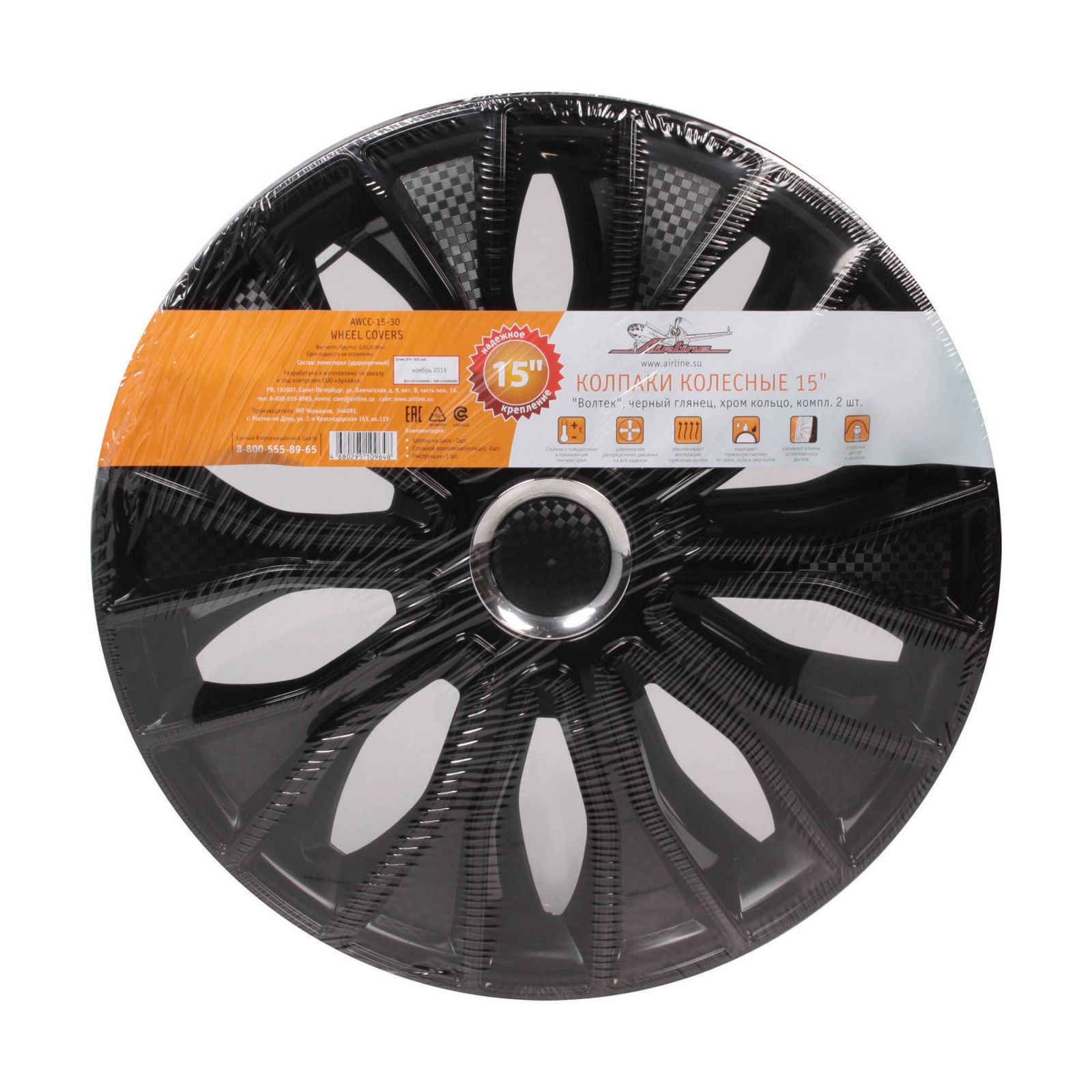 Колпаки колесные 15" "Волтек", черный глянец, хром кольцо, компл. 2 шт. (AWCC-15-30)