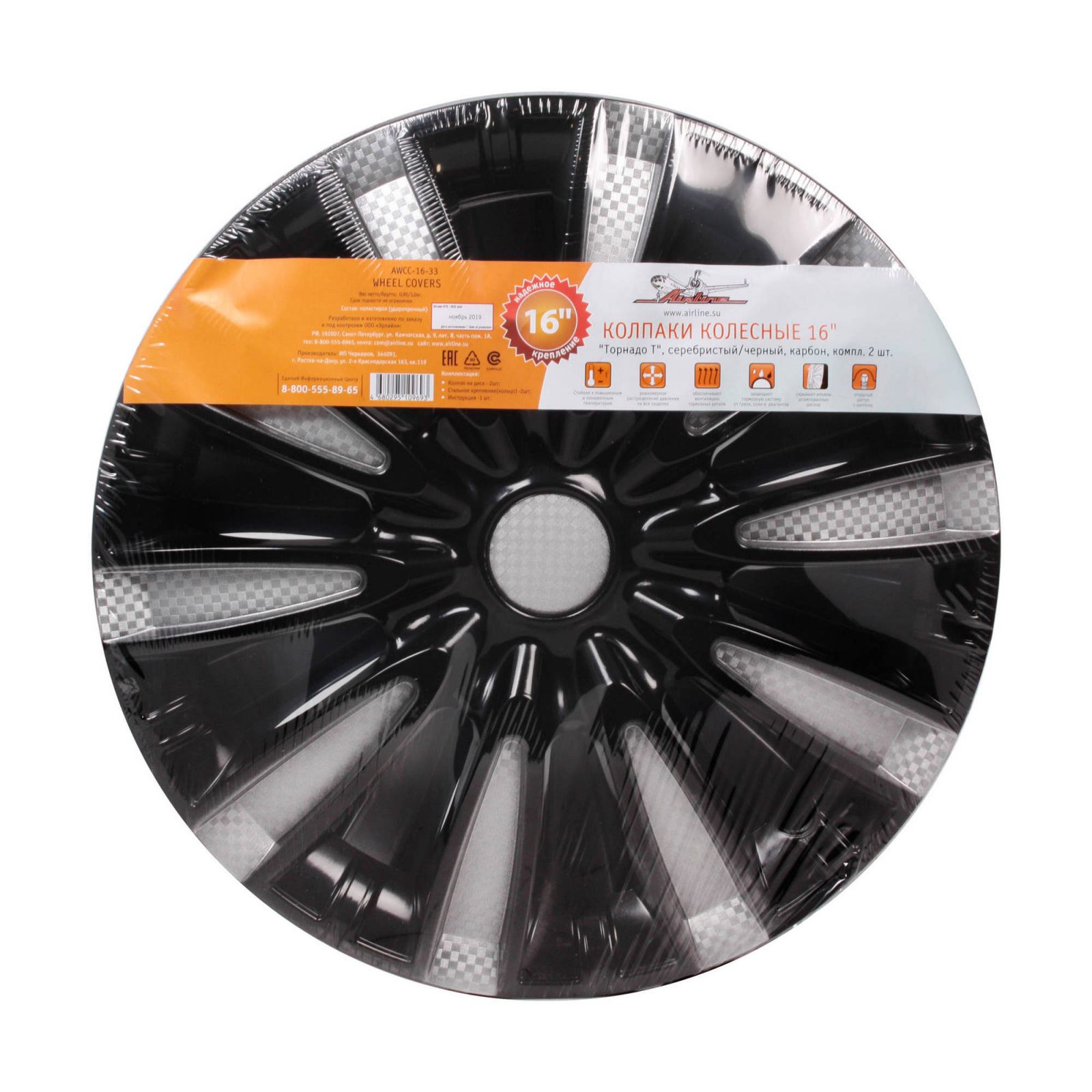 Колпаки колесные 16" "Торнадо Т", серебристый/черный, карбон, компл. 2 шт. (AWCC-16-33)