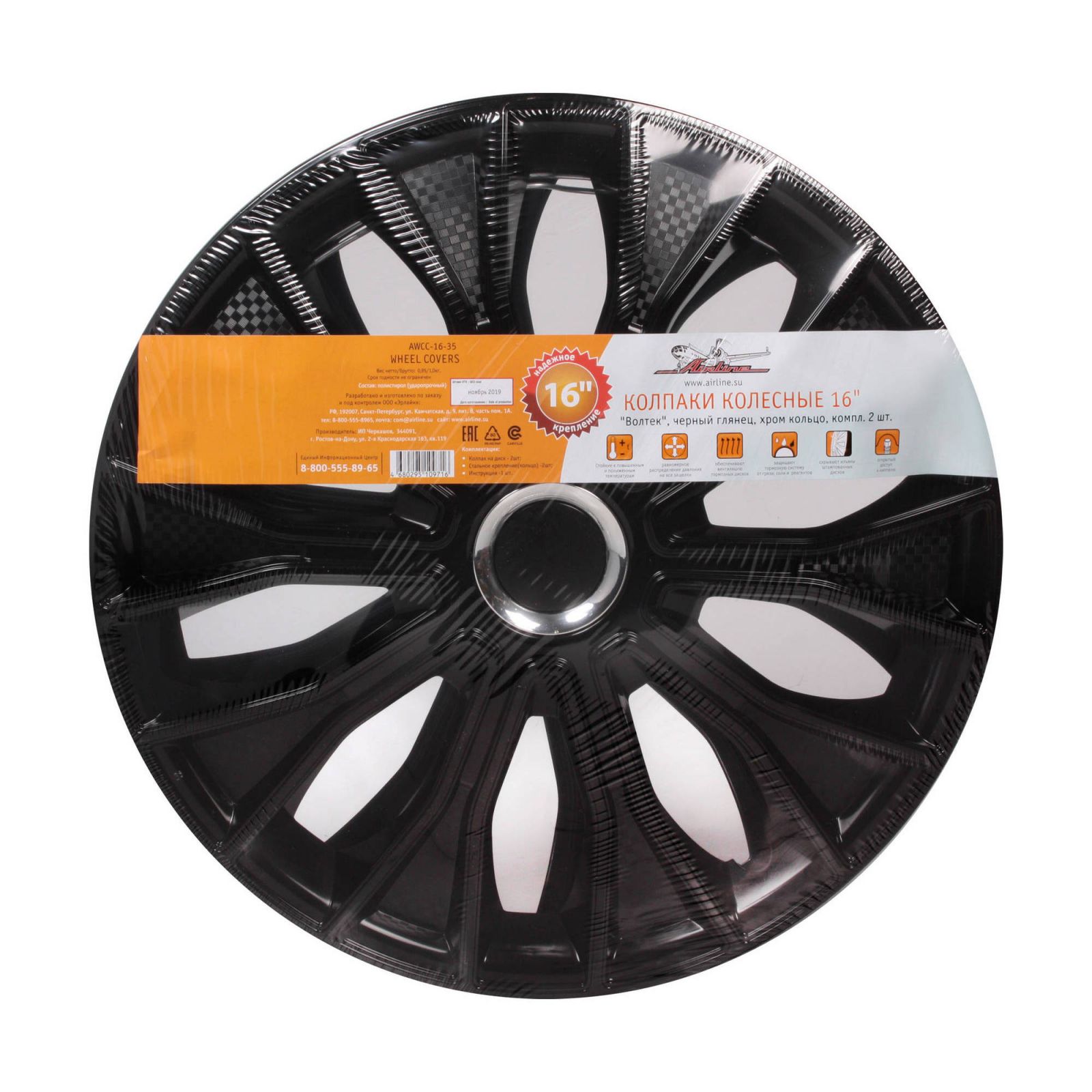 Колпаки колесные 16" "Волтек", черный глянец, хром кольцо, компл. 2 шт. (AWCC-16-35)