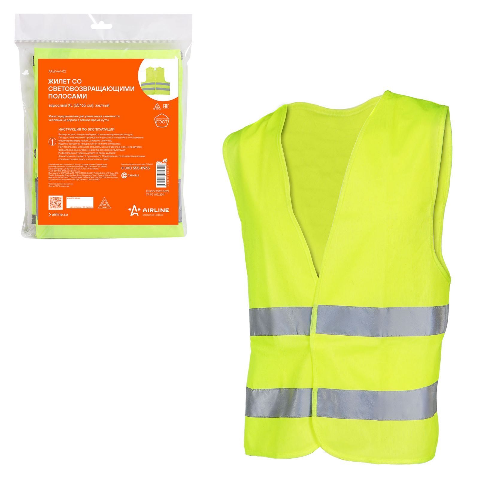 Жилет со световозвращающими полосами, взрослый, р. XL (65*65 см), желтый (ARW-AV-02)