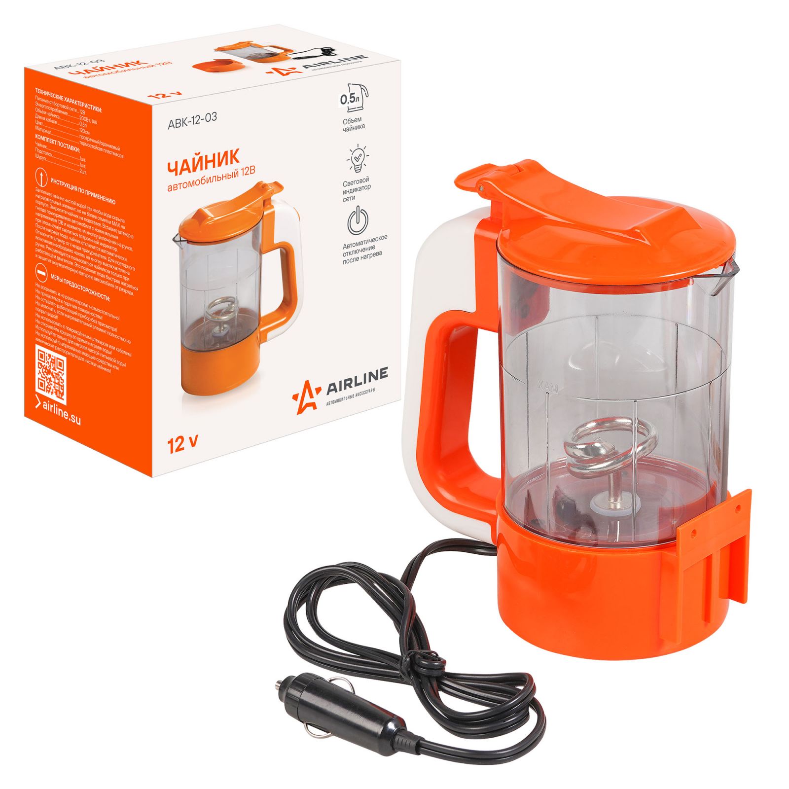 Чайник автомобильный 12В прозрачный/оранжевый пластик (ABK-12-03)
