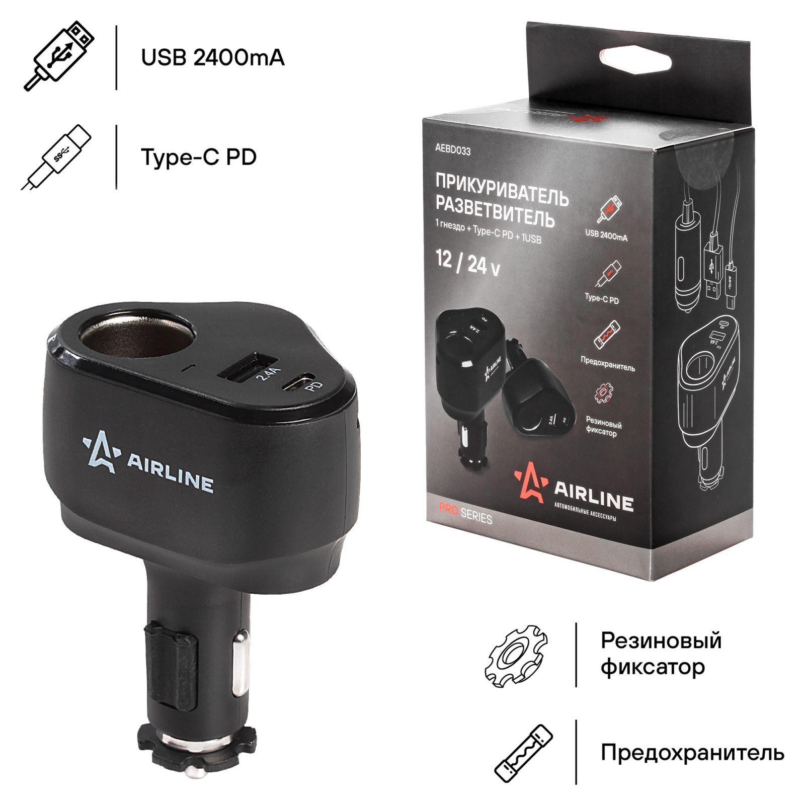 Разветвитель прикуривателя 1 гнездо 5А + Type-C PD + 1USB 2.4A 30Вт PRO (AEBD033)
