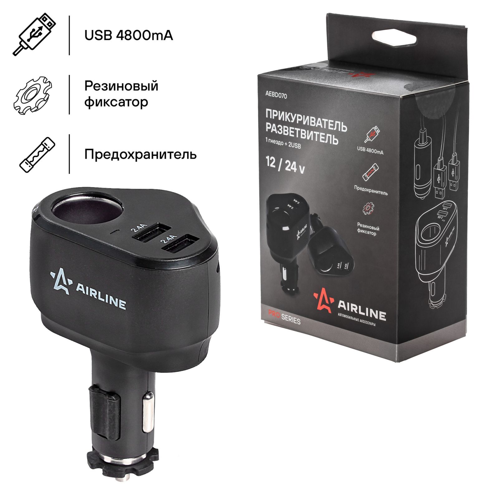 Разветвитель прикуривателя 1 гнездо 5А + 2xUSB 2.4A+2.4A PRO (AEBD070)