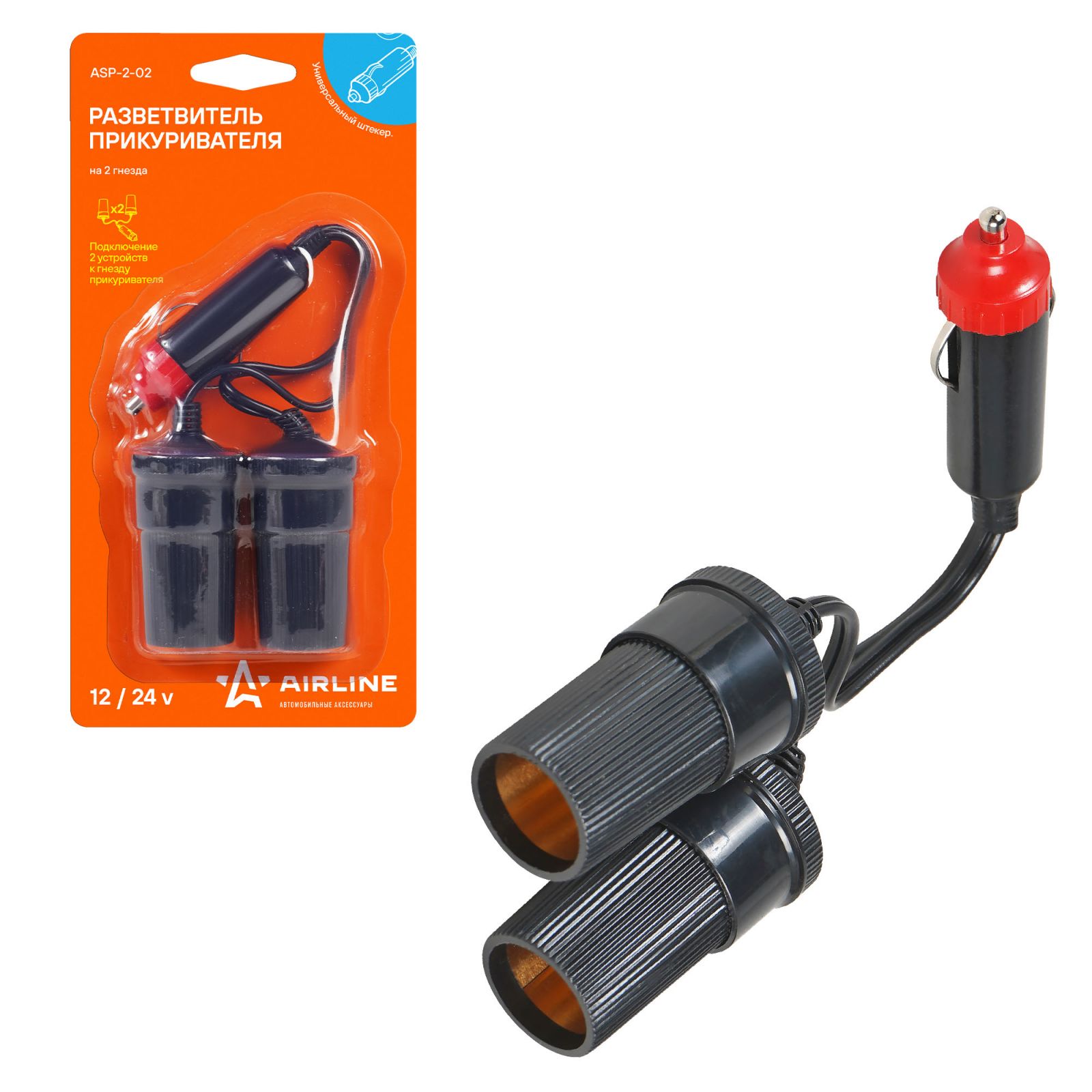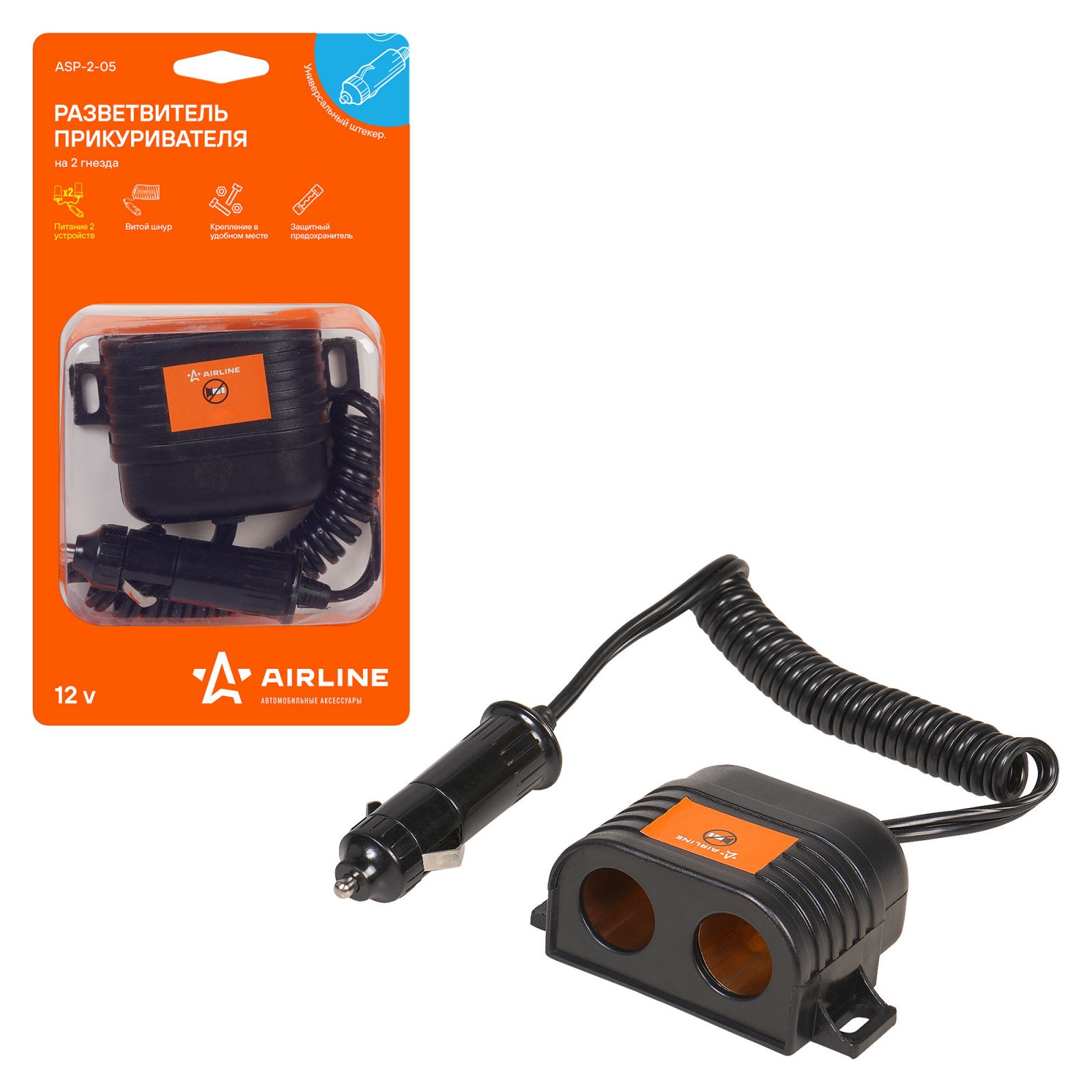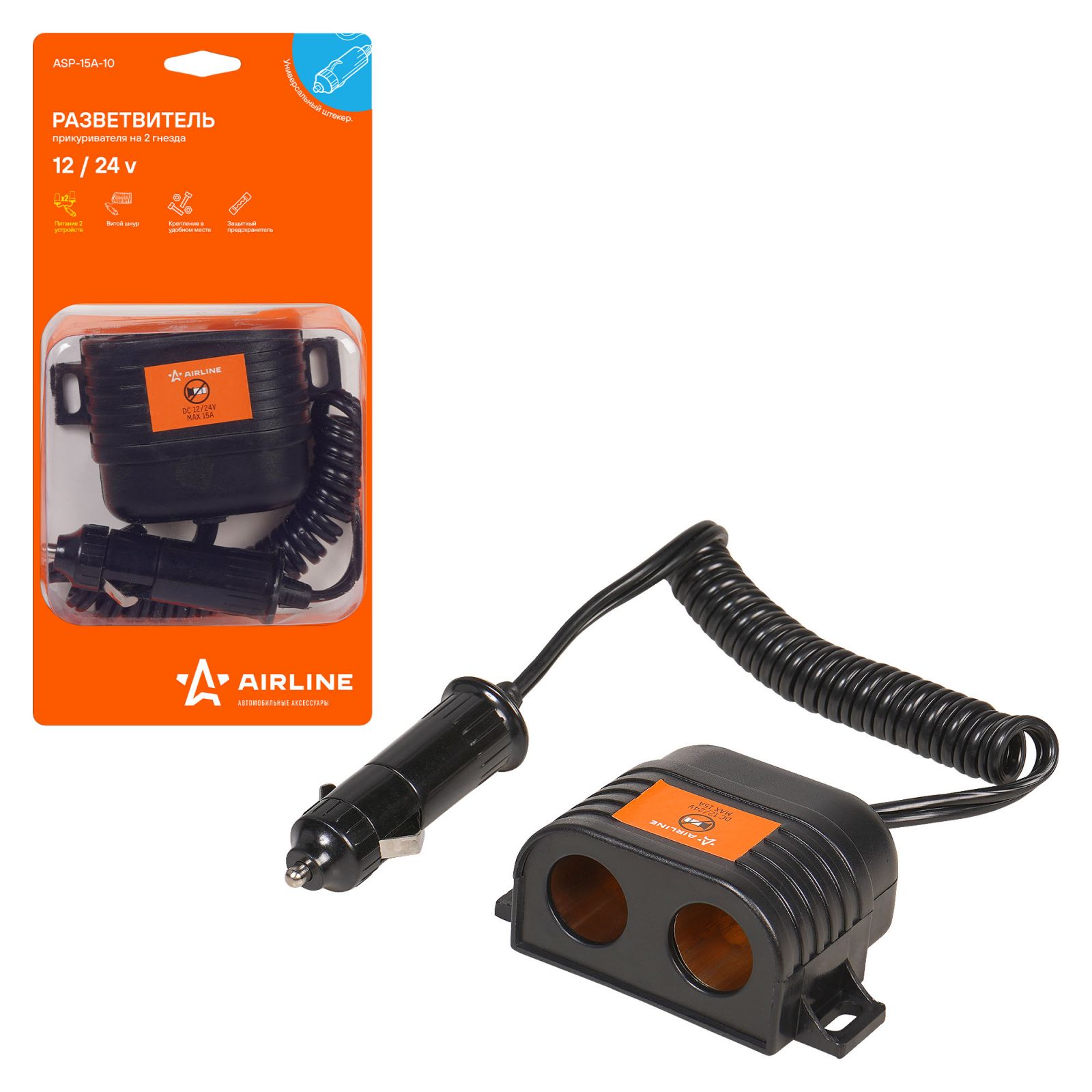 Разветвитель прикуривателя 2 гнезда 15А, витой шнур (ASP-15A-10)