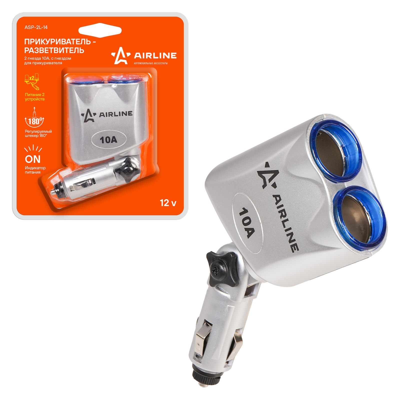 Разветвитель прикуривателя 2 гнезда 10А, с гнездом для прикуривателя (ASP-2L-14)