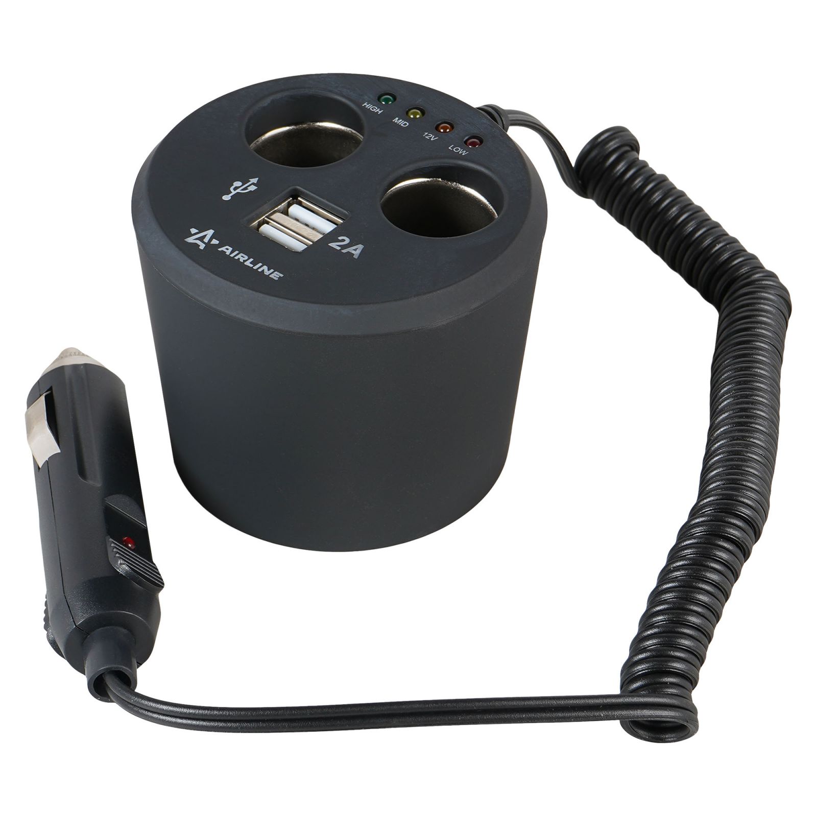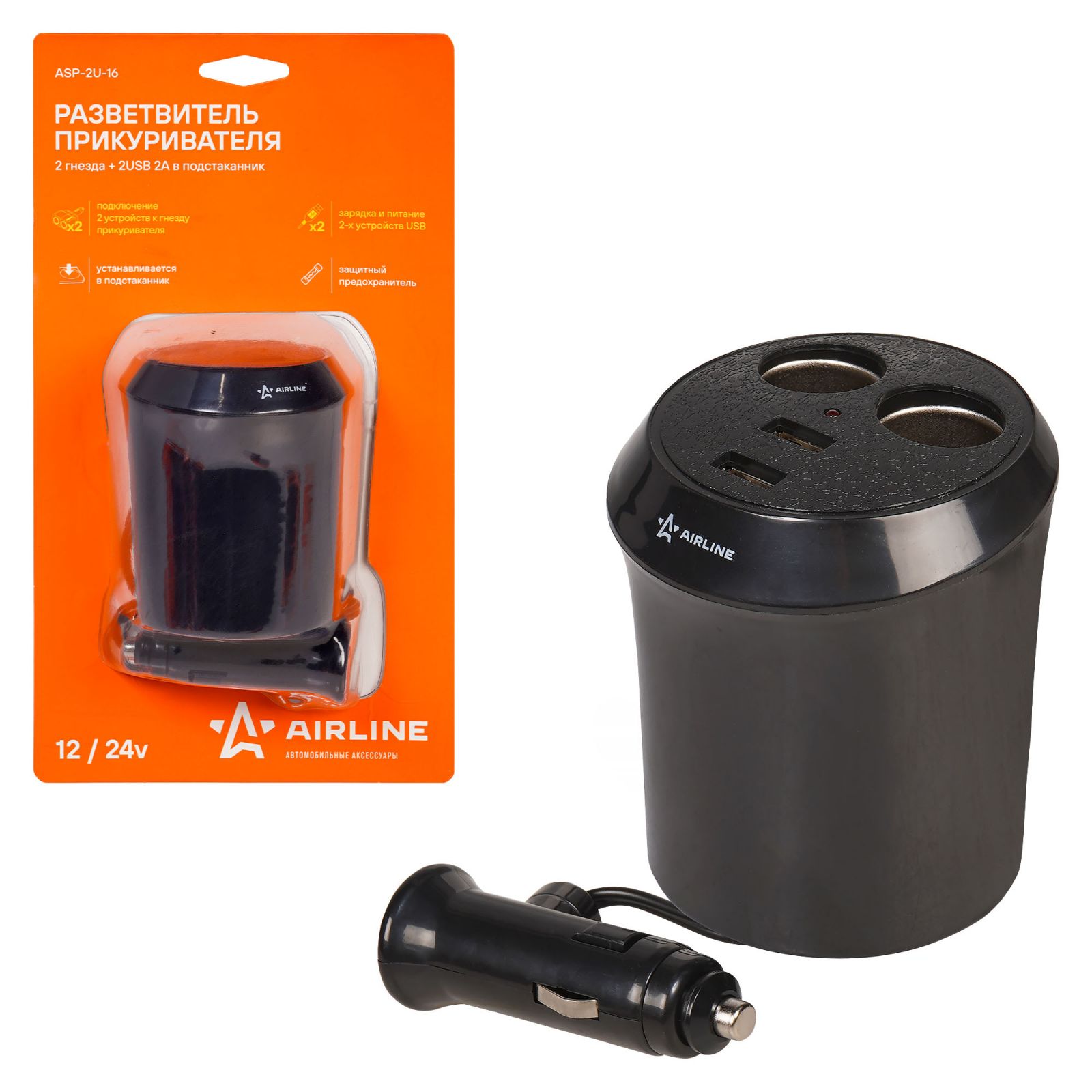 Разветвитель прикуривателя 2 гнезда 5А + 2USB в подстаканник (ASP-2U-16)