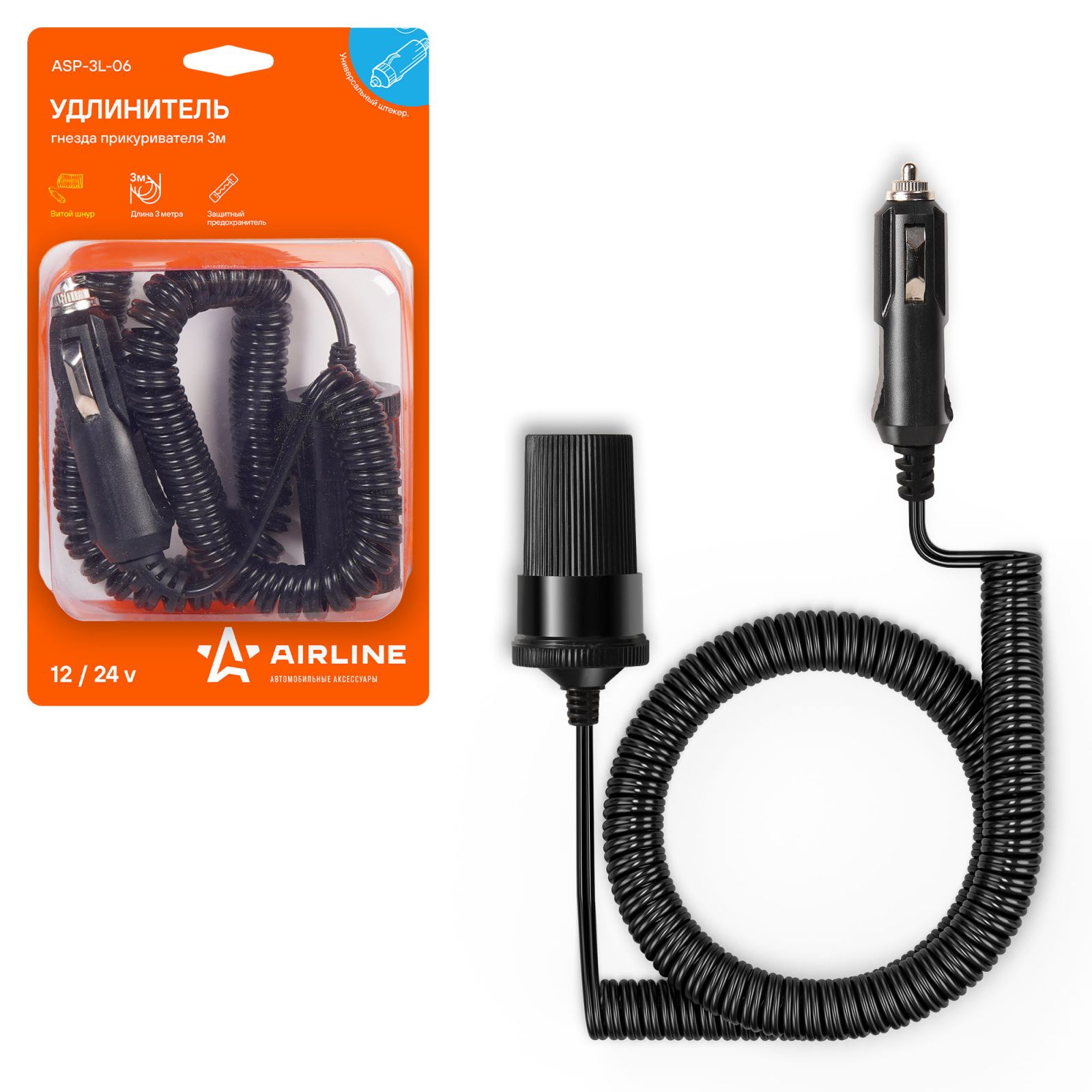 Удлинитель прикуривателя с витым шнуром 3 м (ASP-3L-06)