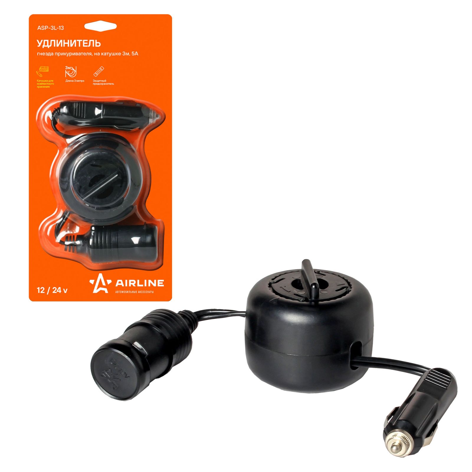 Удлинитель прикуривателя на катушке 3м, 5А (ASP-3L-13)