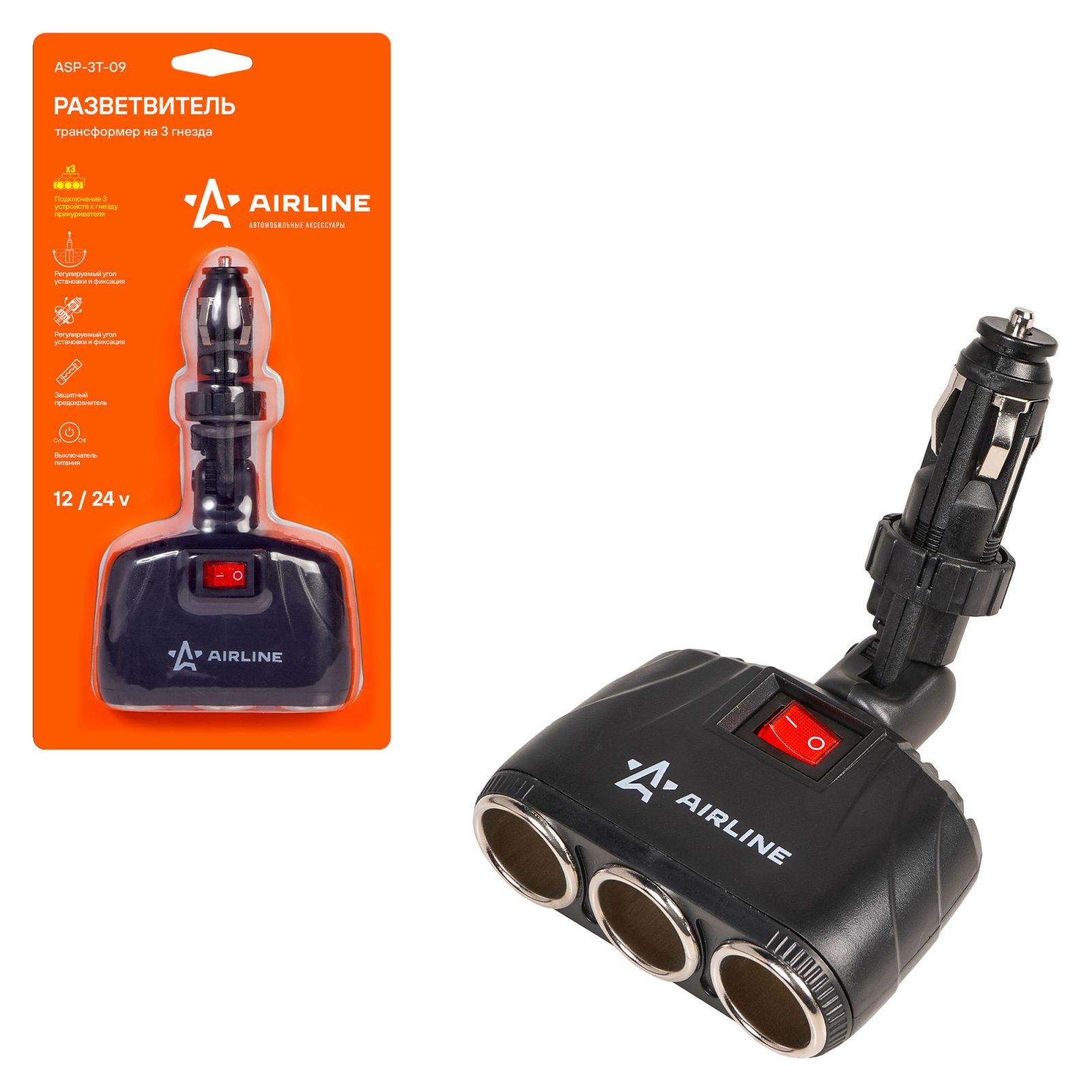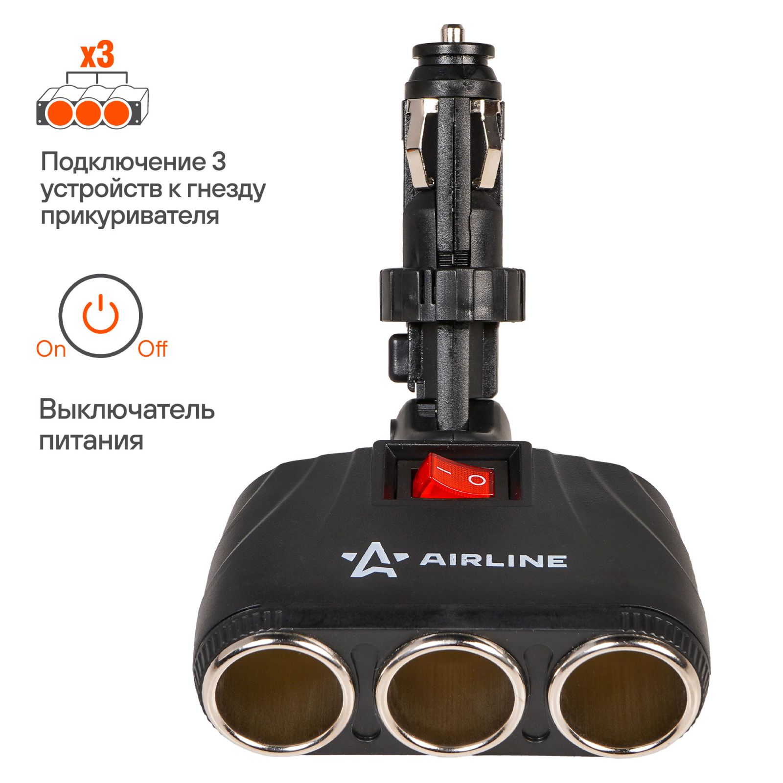 Разветвитель прикуривателя трансформер на 3 гнезда 8А, штекер-фиксатор (ASP-3T-09)